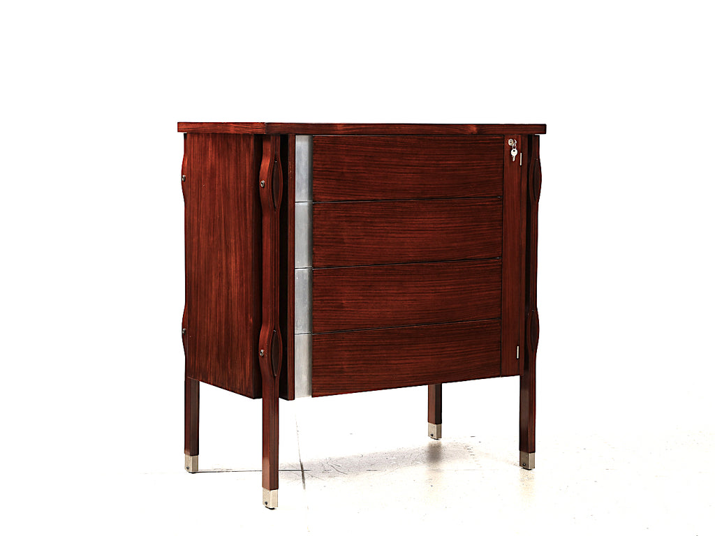 Italy | c. 1959 Rosewood, aluminum, brass. Chest of drawers from the Taormina line for MIM. 4 drawers with hidden locking side panel & original key. Fantastic design with curved wood legs and elliptical slab-stretchers.