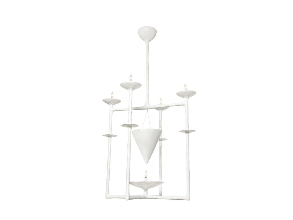 Plaster, metal. Delicate, handmade plaster form of intersecting square structures with four light sources, plus one bottom light source illuminating a suspended cone. Made per order in France with a 6-8 month lead-time required.