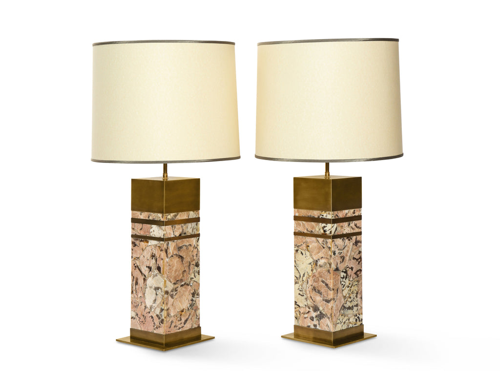 Italy | 2016 Square column lamps of graphic jasper, & oxidized brass. Each lamp has two adjustable standard sockets, and switches on the cord. These lamps are made-to-order in France and can be customized in a few different ways. 20-24 week lead time for standard orders.
