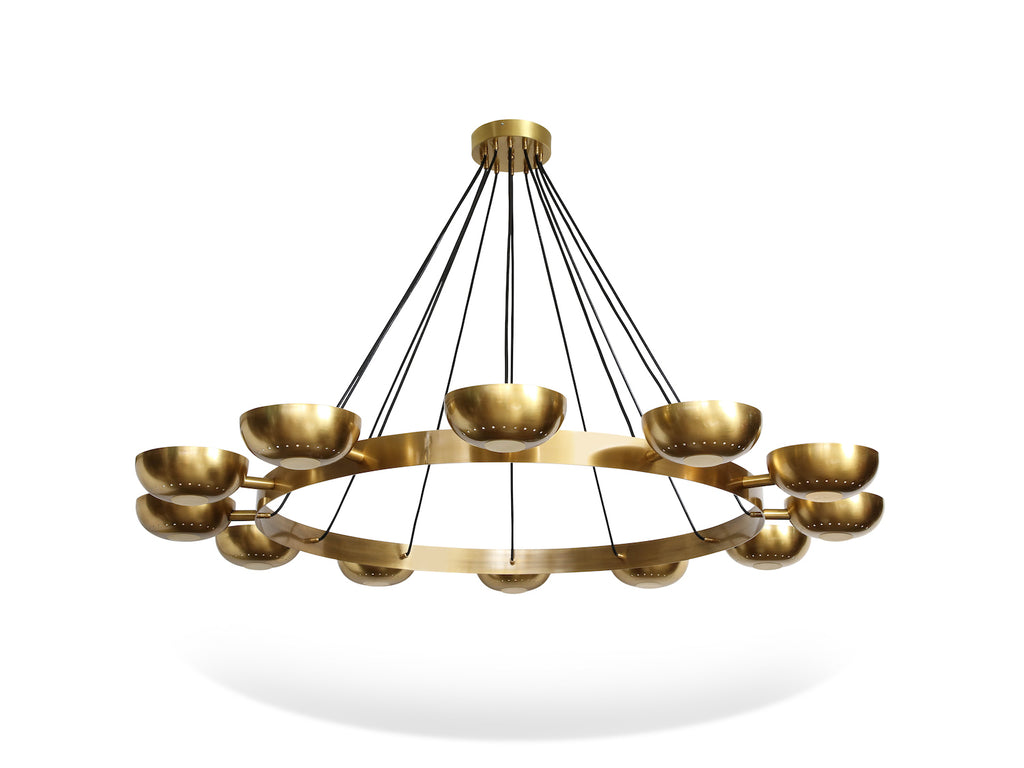Italy | 2023 Brass, frosted glass, rubber cord. Impressive large scale fixture with patinated brass fittings, perforated cups and frosted glass diffusers.
