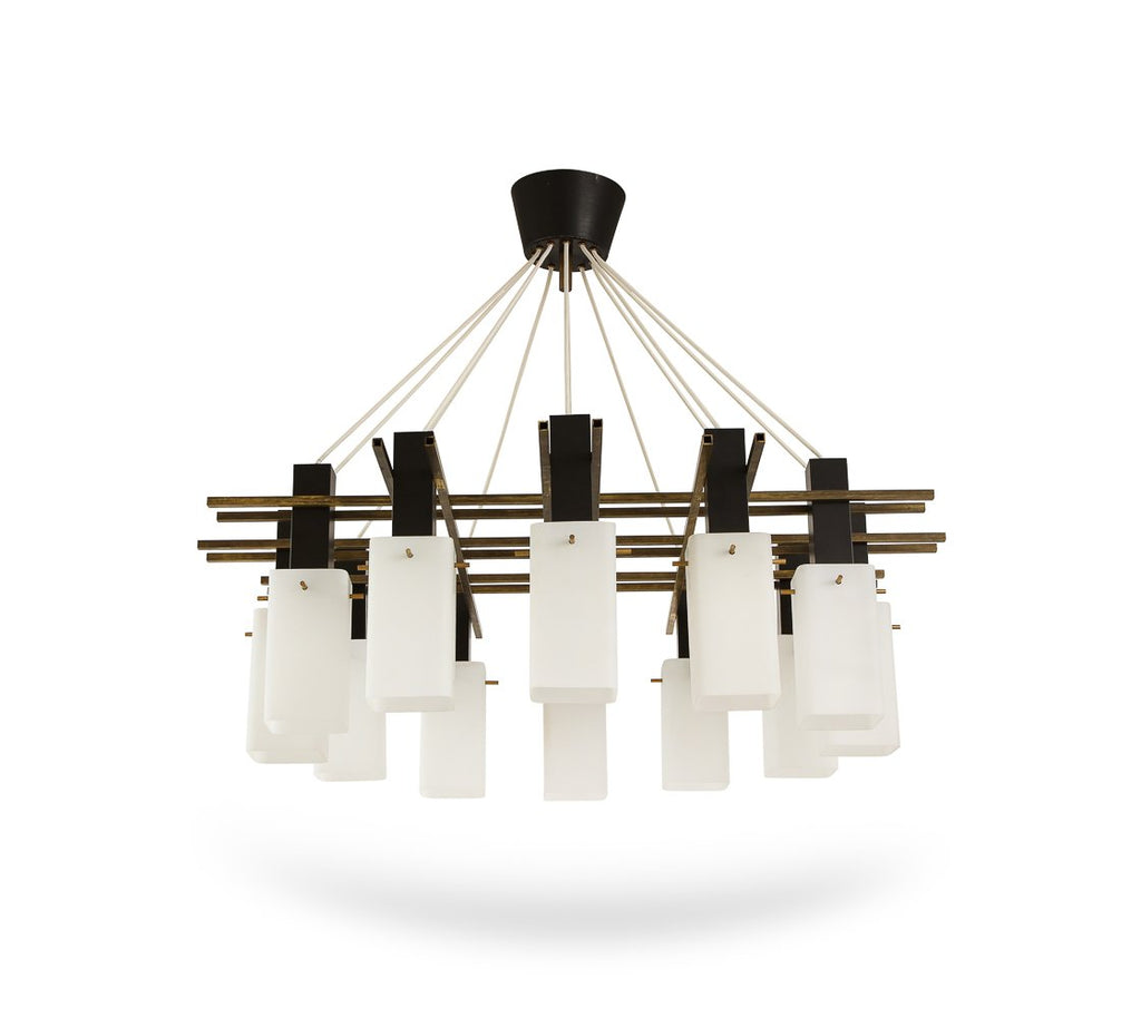 Italy | c. 1962 Brass, painted metal, frosted glass, rubber. Twelve frosted, rectangular, cylindrical glass shades suspended by brass and painted metal supports.
