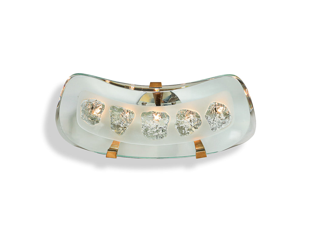 Italy | c. 1958 Frosted, etched glass, brass, nickel. A rare and large model featuring an elegantly carved, large glass shield. Price is for single sconce shown. *2nd example available with slightly different glass color. Please see last 3 photos.