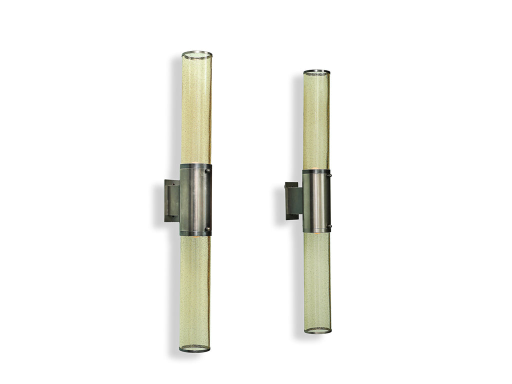 Italy | c. 1980 Nickled metal, blown glass. Blown glass tubes with gold inclusions and metal rims. 2 x E26 sockets per light.