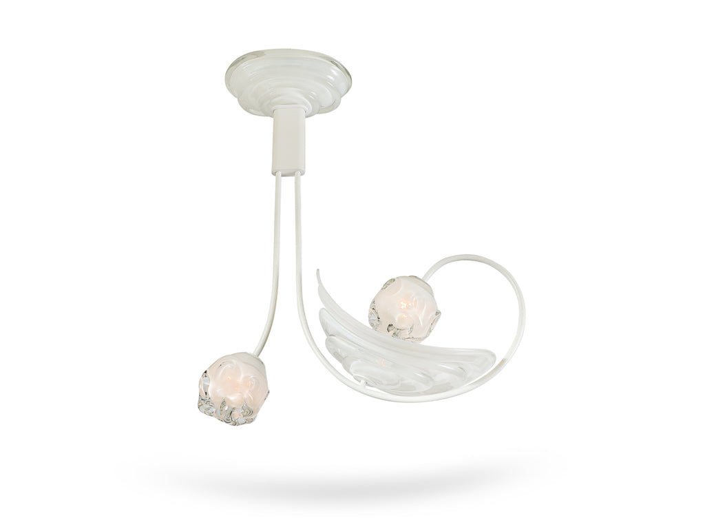 Hand-blown, hot-sculpted glass, powder-coated brass, aluminum. The canopy is sculpted opaline glass, as are the large rippled reflector and morel shades. Takes 2 x E12 [candelabra] sockets - recommended bulbs are T-3 KX-2000 incandescent. Made here in New York City, and comes UL certified. Custom variations are available.