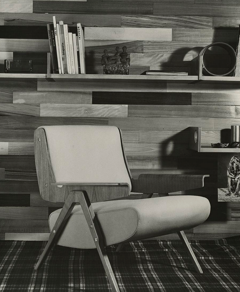 Italy | c. 1955 Bent plywood, mahogany veneer, fabric, brass. Graphic forms with brass mounts and deep green boucle fabric.