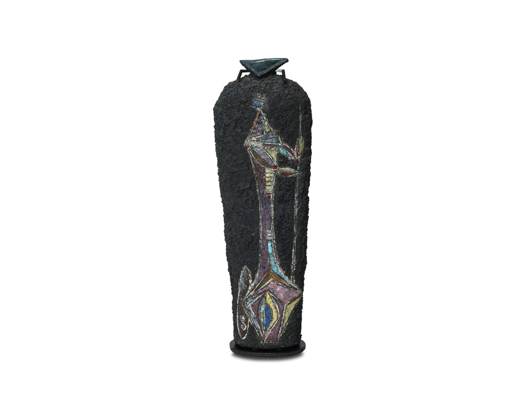 Italy | c. 1958 Tall vase form with pinched neck and triangular spout. Hand-built earthenware with rough, matte black glaze, and multicolored cubist figure on front. Signed underneath. An unobtrusive and removable stand was recently created for this piece.