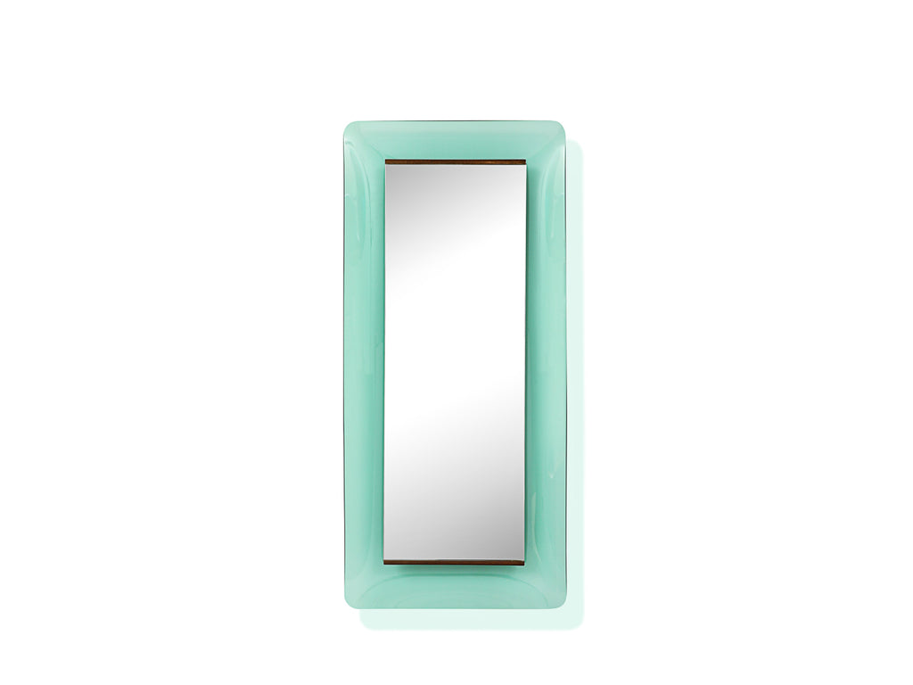 Italy | c. 1950 Wood structure, colored glass, mirrored glass, mahogany strip. Curved green glass frame. 2nd matching mirror also available. Maker's sticker affixed to rear of mirror.