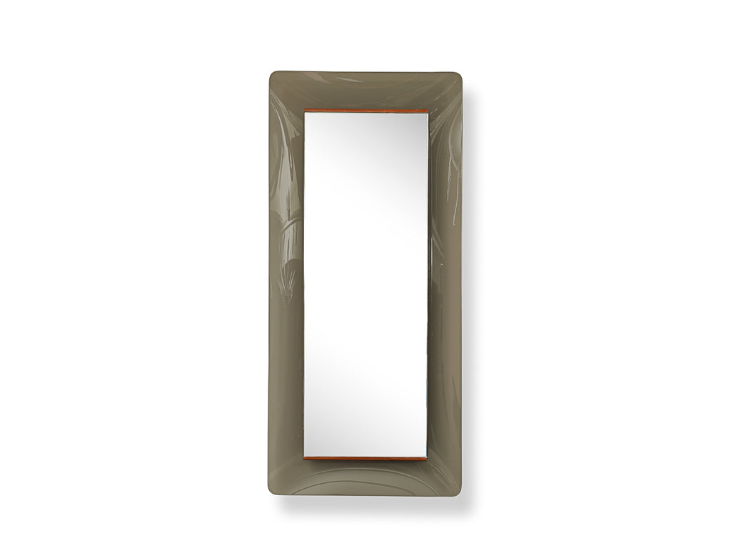 Italy | c. 1950 Wood, colored glass, mirrored glass. Wood structure with gray colored glass frame. Center mirror is supported by a walnut frame which shows slightly at top and bottom of mirror.