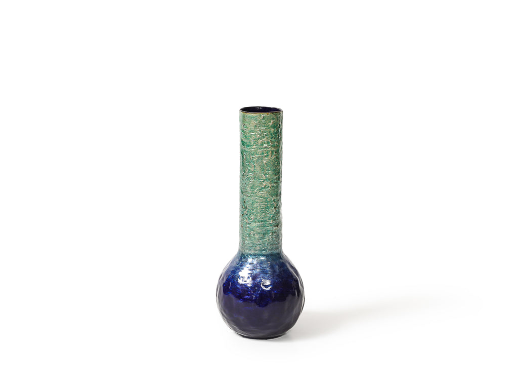 Enameled copper. Hand-hammered vase with bulbous base. Blue & green enameled surface. Etched signature and inscription to underside: "De Poli Italy".