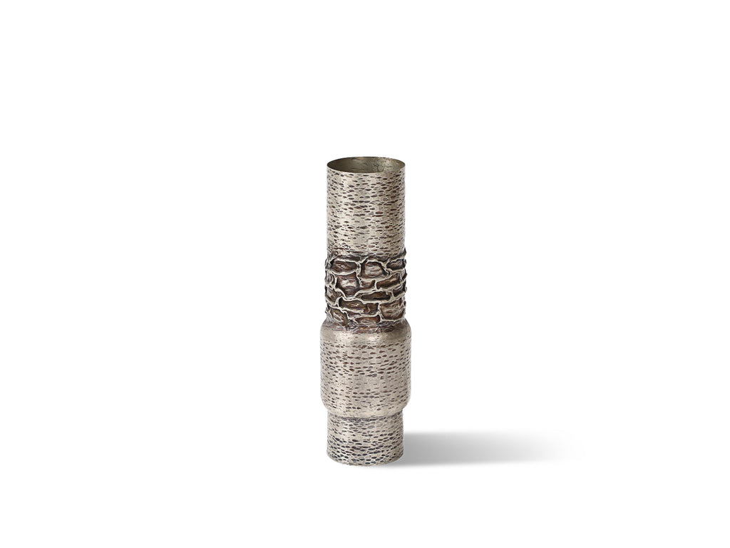 Italy | c. 1965 Aluminum. Hammered vase with textured relief pattern throughout. Stamped signature on underside.