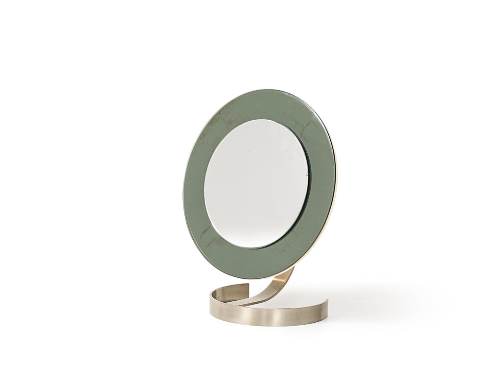 Italy | c. 1970 Wide, smoked-glass border with beveled edge. Flat-banded, steel curved base.