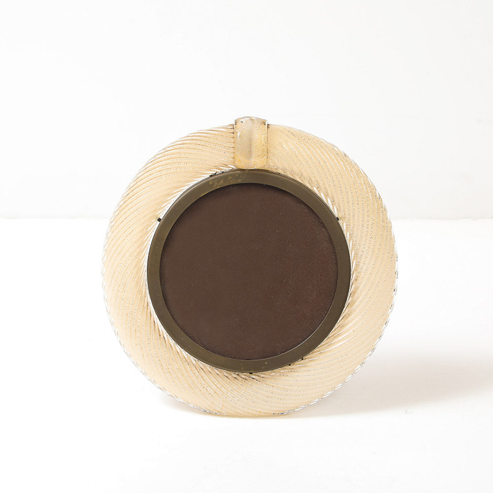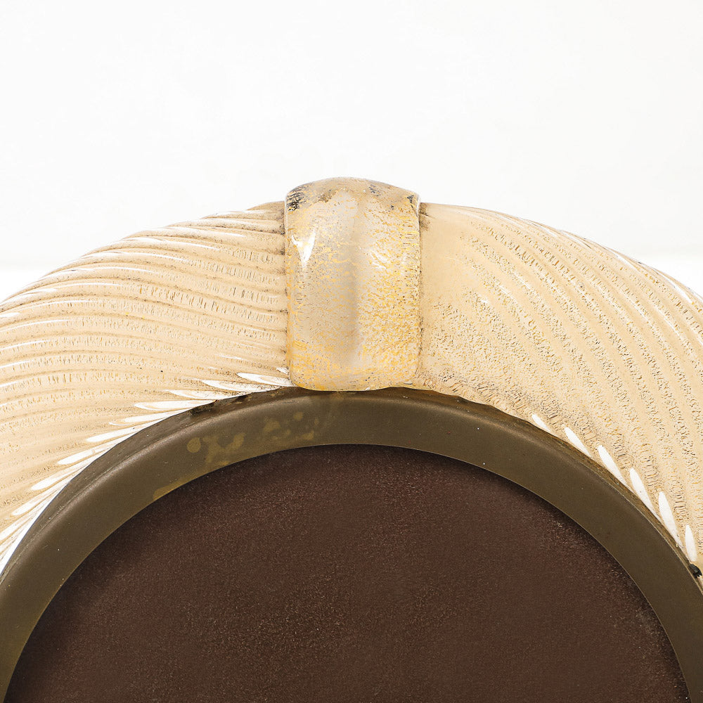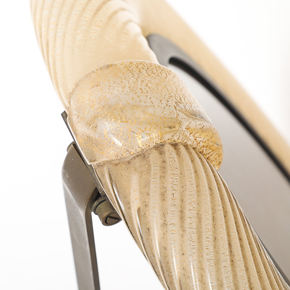 Italy | c. 1976 Blown glass, brass, velvet covered board. Elegant bullnose frame of clear, ribbed glass with internal gold flecks. Brass mounts and retractable foot. Artist-signed on foot.