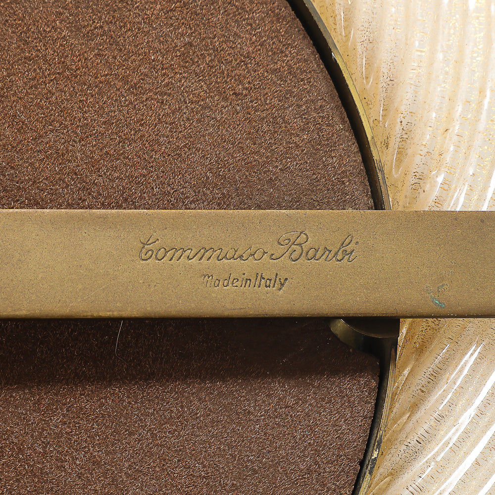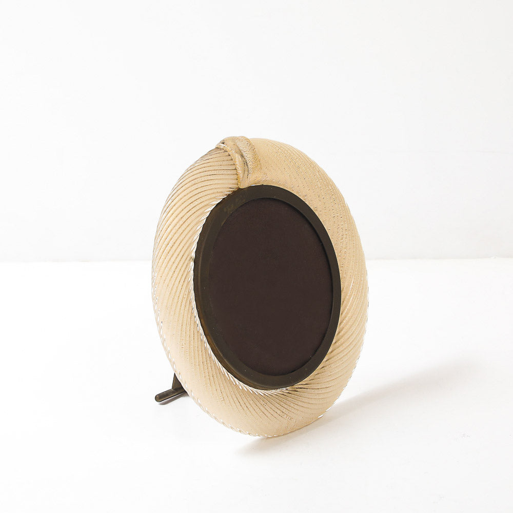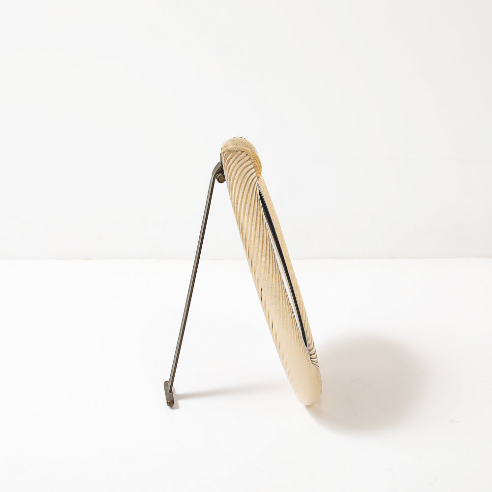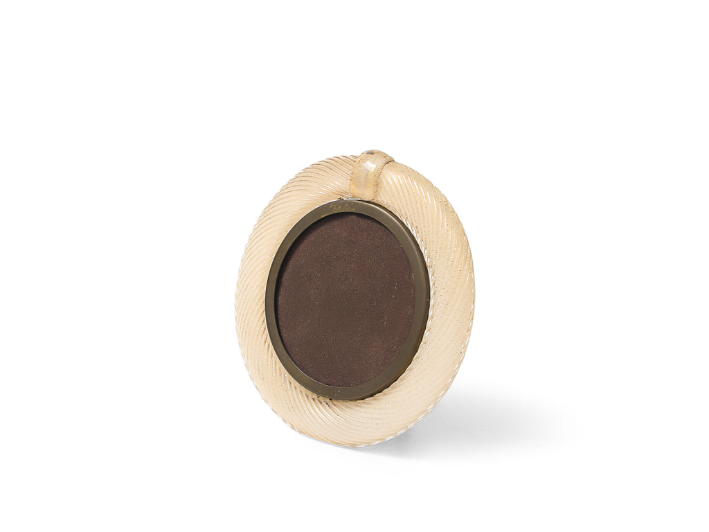Italy | c. 1976 Blown glass, brass, velvet covered board. Elegant bullnose frame of clear, ribbed glass with internal gold flecks. Brass mounts and retractable foot. Artist-signed on foot.