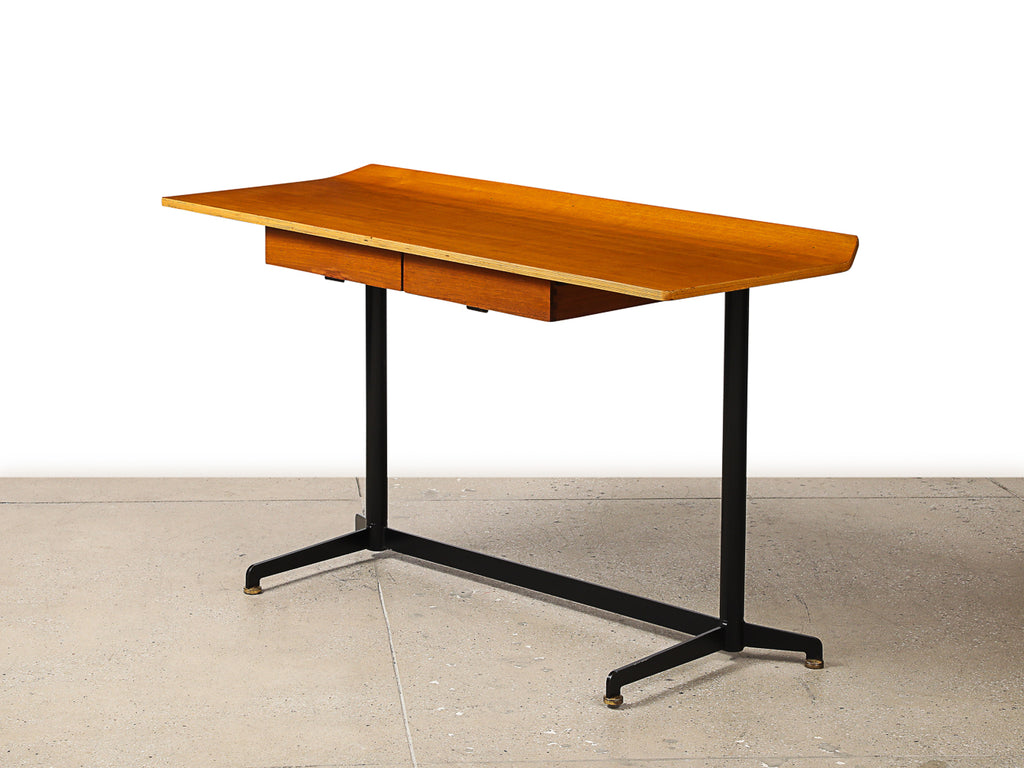 Italy | c. 1953 Plywood, cherry veneer, brass, painted iron. Light wood top with canted back edge. 2 drawers with discreet brass pulls. A variant of this model was presented at the 10th Triennale, Milano in 1954. Partial Tecno label affixed to underside.