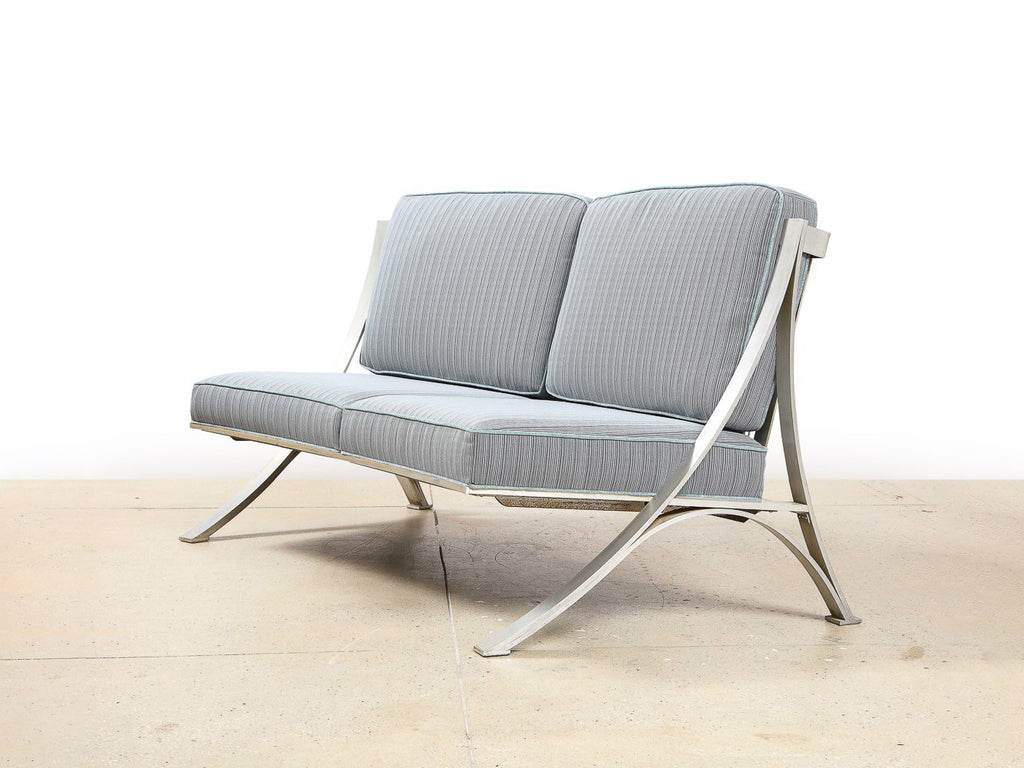 Aluminum, upholstery, wood. This custom settee is from a unique pair by Paul Laszlo.