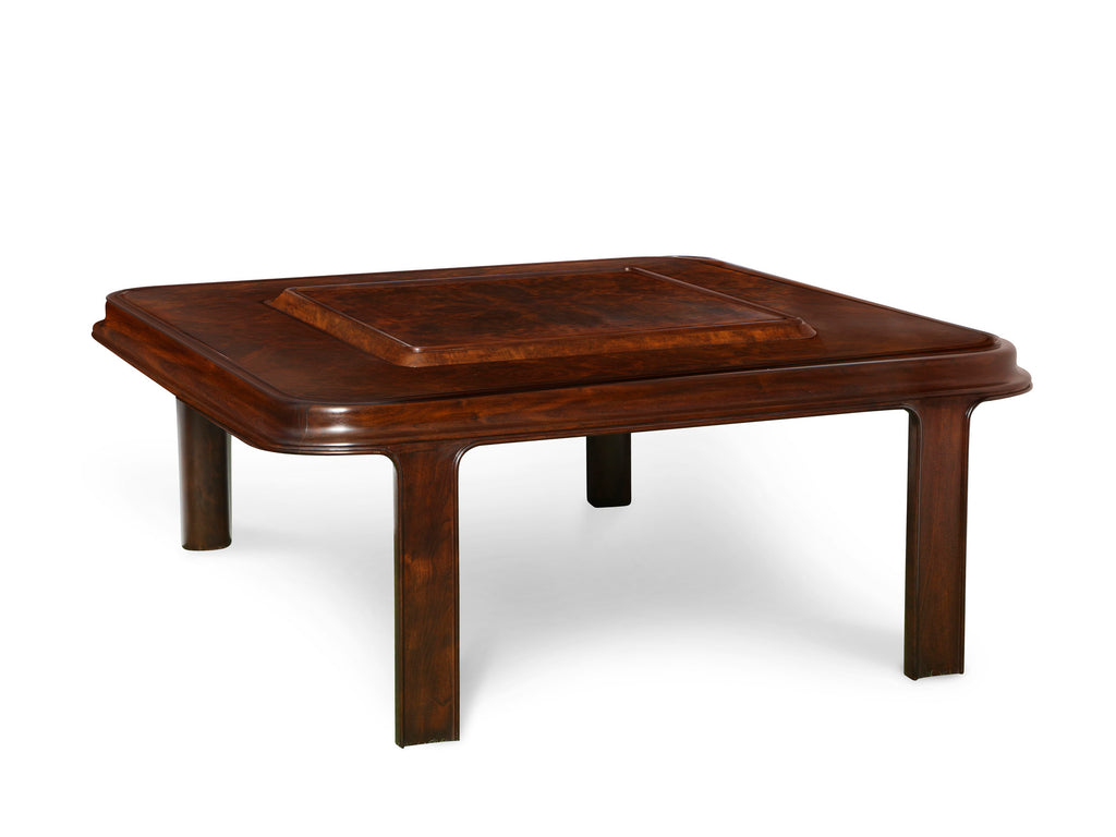 Large-scale low table with rounded corners, 2-level burl wood top & finely crafted detailing. This unique table was created for a Bel Air home & appears to have never been repeated in any other László commission.