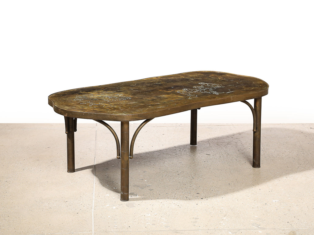 USA | c. 1968 Patinated bronze with wood. Table top with torched finish and etched figural decorations.