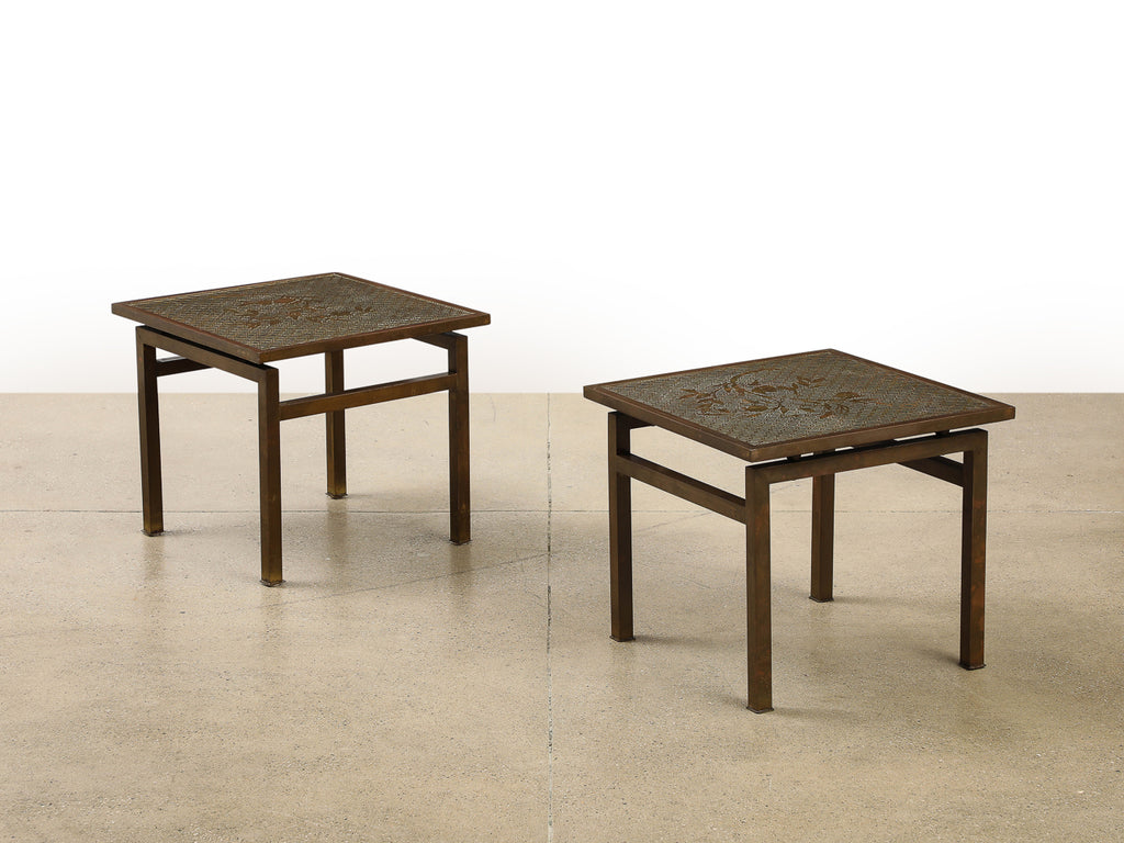USA | c. 1967 Bronze, pewter, wood. Acid-etched relief pattern on metal with wood. Original shipping labels attached to underside of each table.