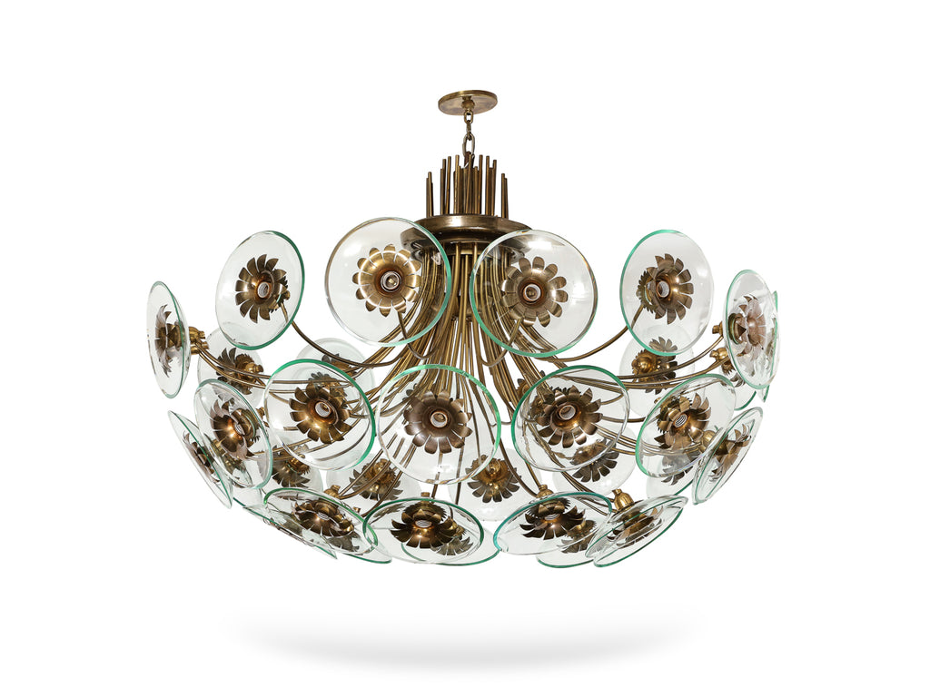 Italy | c. 1938 Brass, glass. A rare model resembling a hanging bouquet of flowers turned upside down. This monumental fixture features 37 arms, each ending with a brass flower and glass bobeche. 37 x E26 sockets.