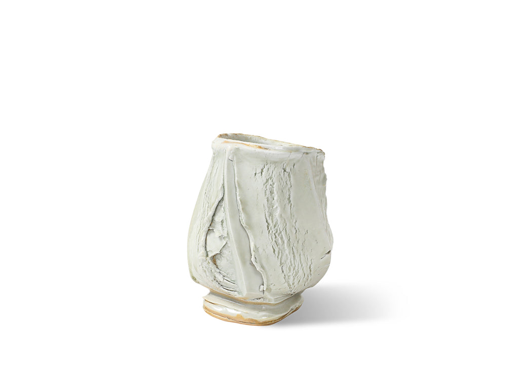 Glazed porcelain. Hand-built small vessel form with cream glazes. Artist-signed on underside.