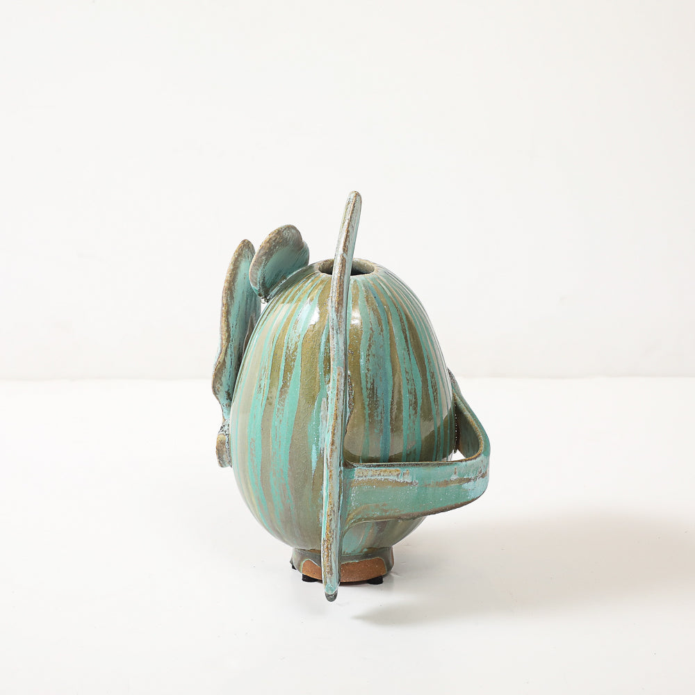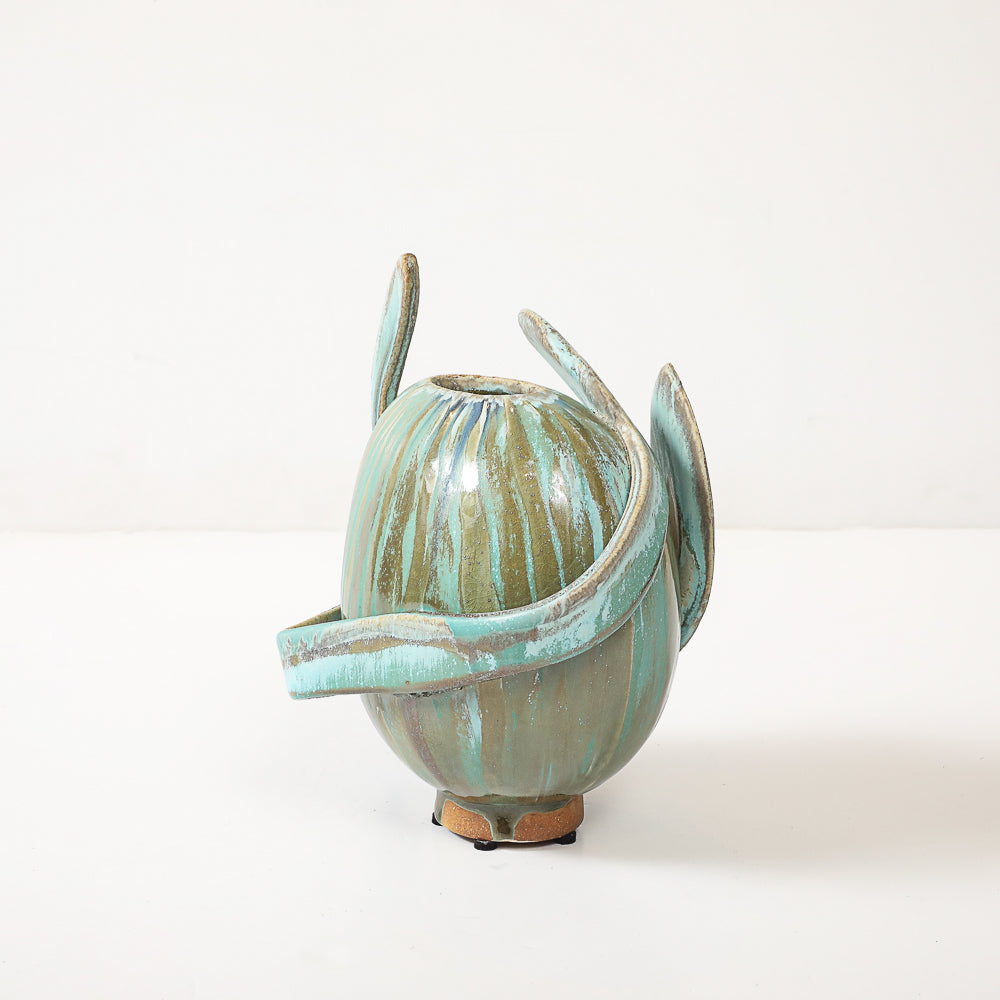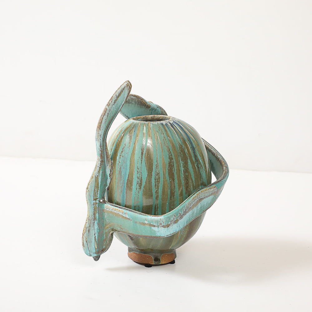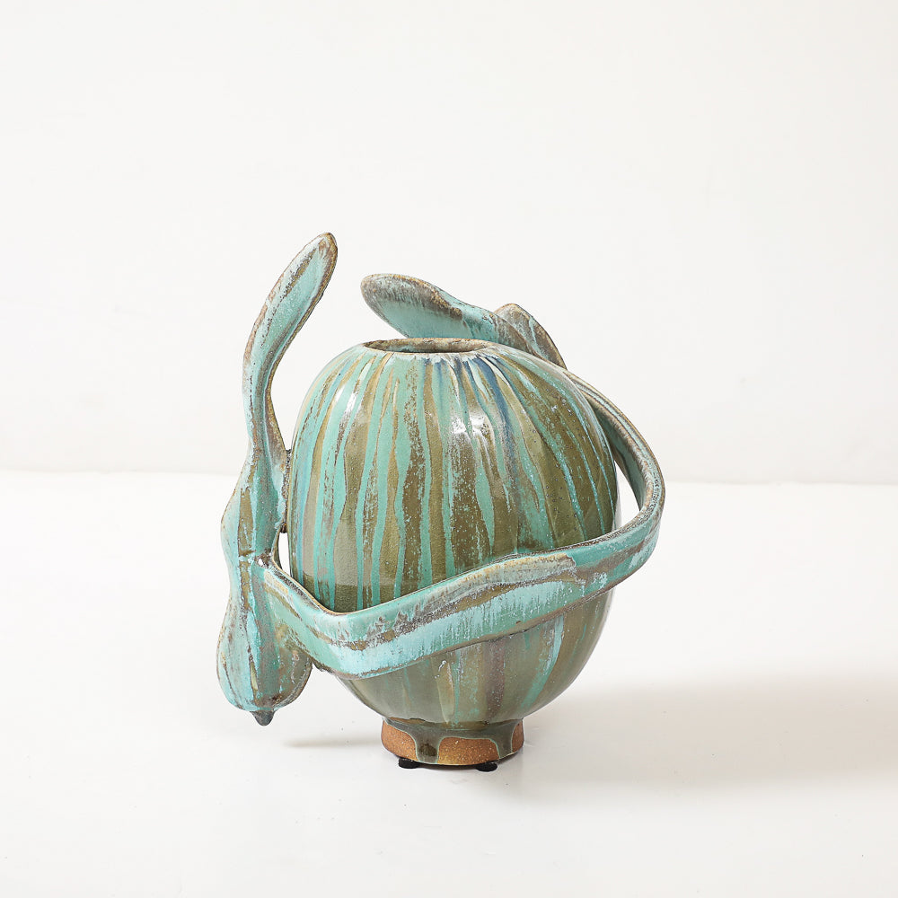 Glazed stoneware. Organic form with green & blue glazes and applied leaves. Artist-signed on the underside.