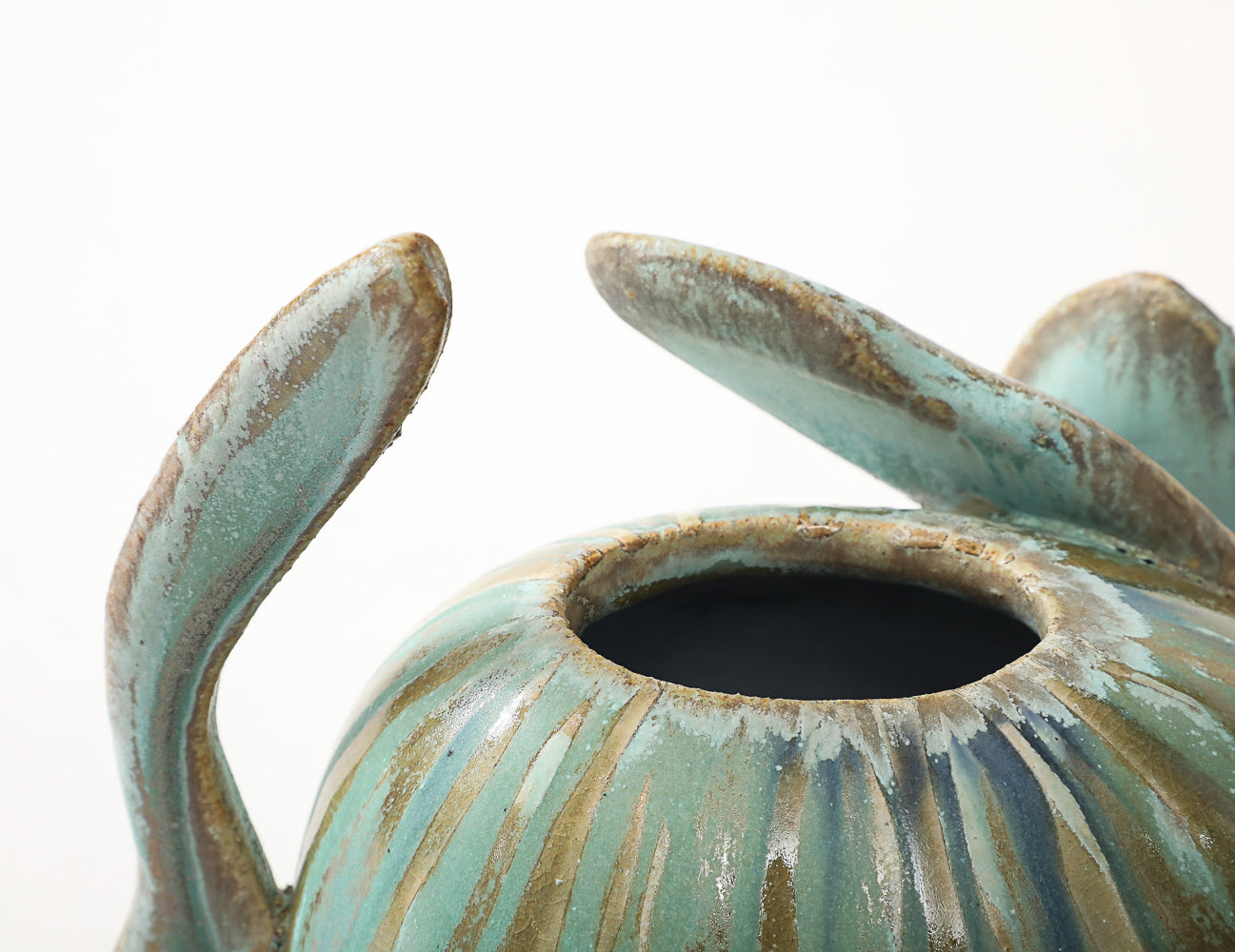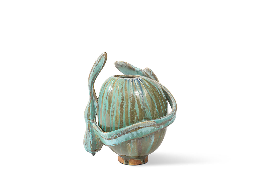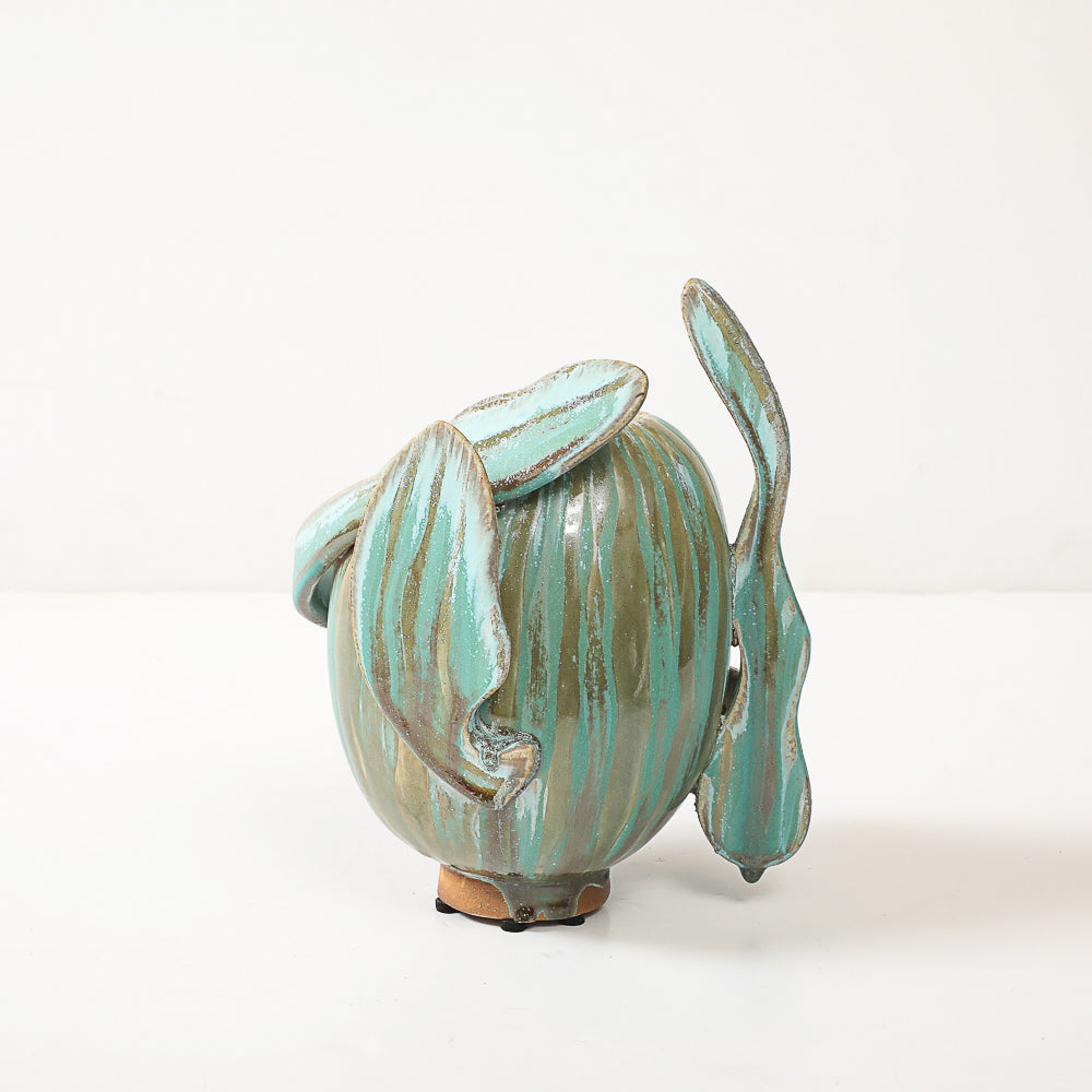 Glazed stoneware. Organic form with green & blue glazes and applied leaves. Artist-signed on the underside.