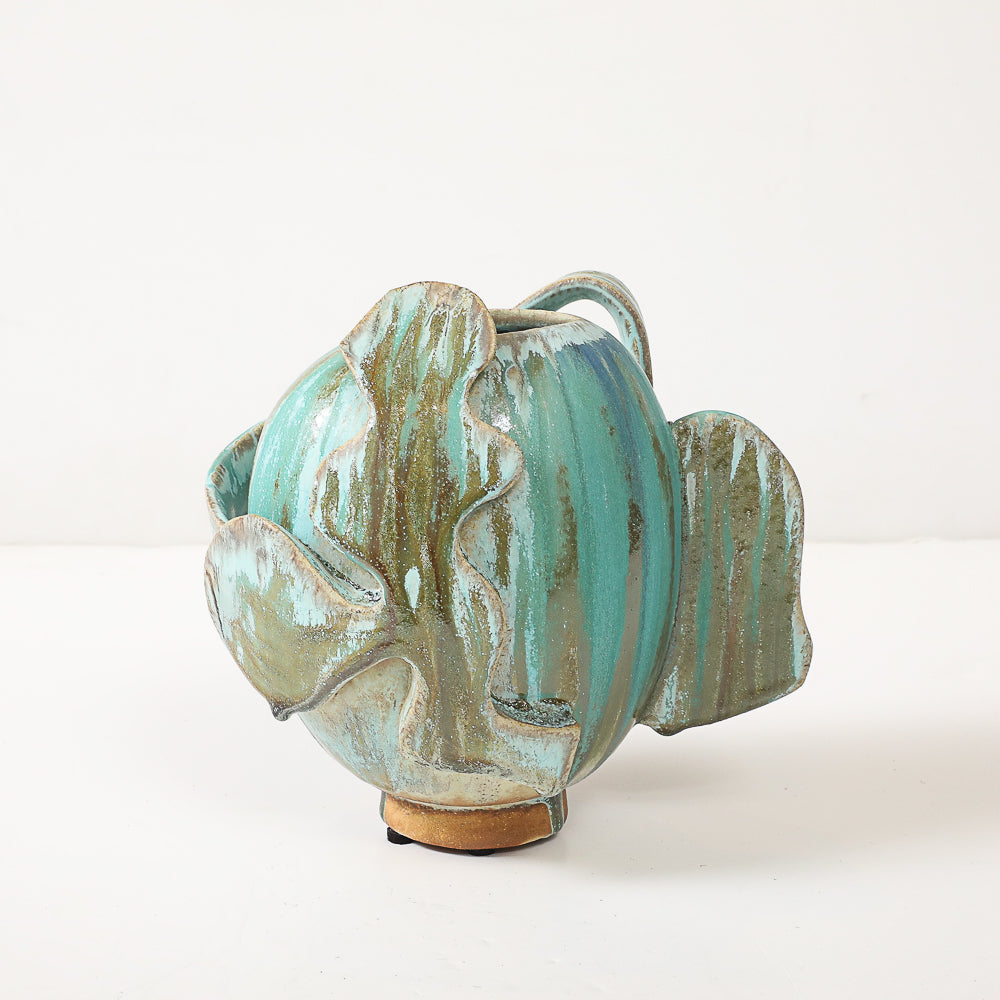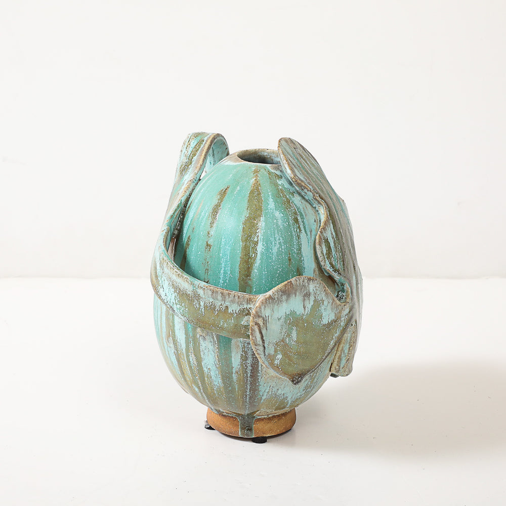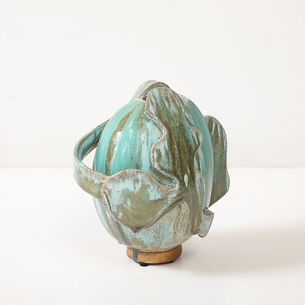 Glazed stoneware. Organic form with green and blue glazes and applied leaves. Artist-signed on the underside.