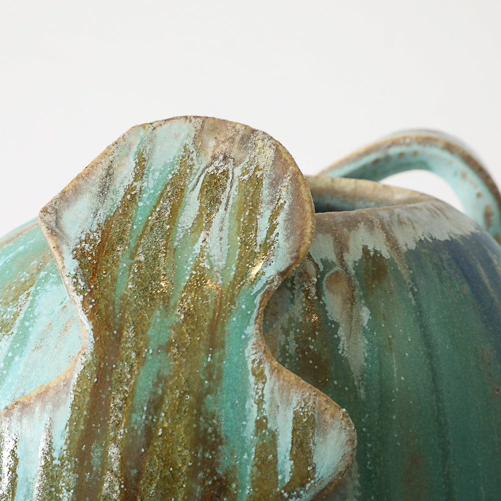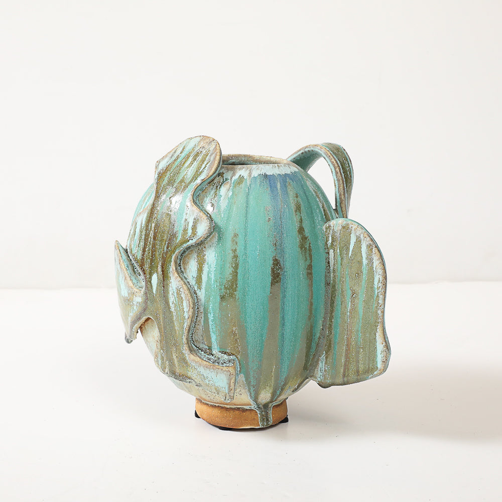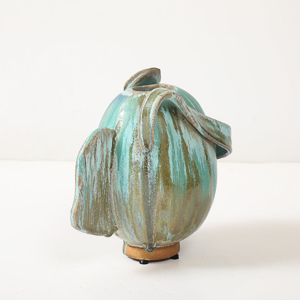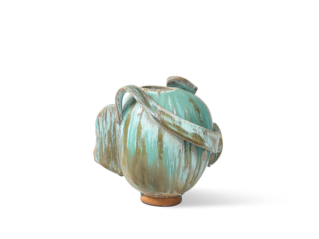 Glazed stoneware. Organic form with green and blue glazes and applied leaves. Artist-signed on the underside.