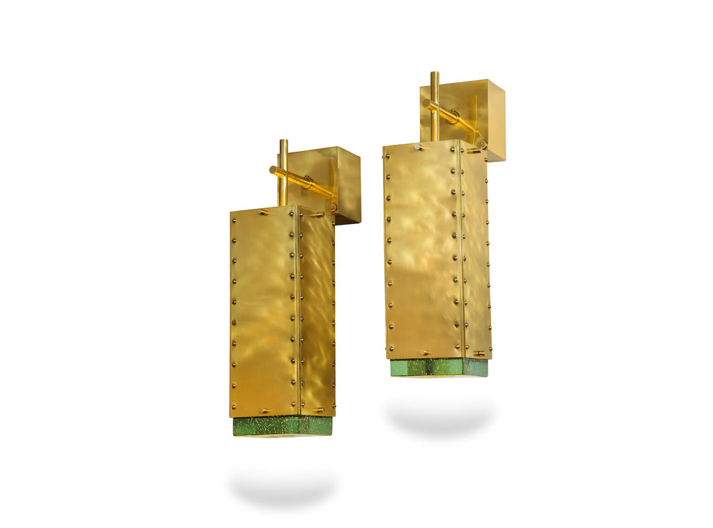 Italy | 2017 Elegant brass panels with studded sides & thick slabs of cast green glass with bubbles. LED lit and custom wall plates. *2nd matching pair available.