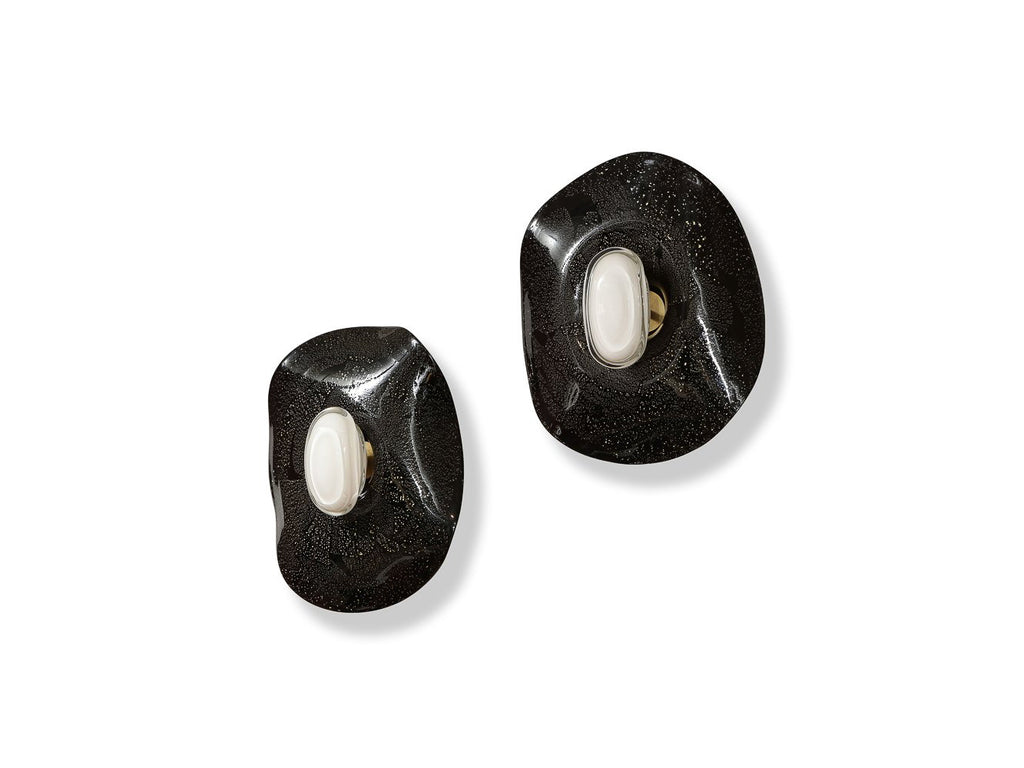Glass, Japanese gold foil, brass. Handblown platter forms inlaid with Japanese gold foil and sculpted glass diffusers. These fixtures are signed by the artist, UL certified and made per order here in New York City. Each fixture is fitted with one candelabra socket. We recommend using T-3 40w or 60w candelabra bulbs. Custom colors & metal finishes available. Choose from several hot-sculpted diffuser options. 16-20 week lead time. Can be mounted on the ceiling as well. There are currently no floor models available, so these would have to be ordered.