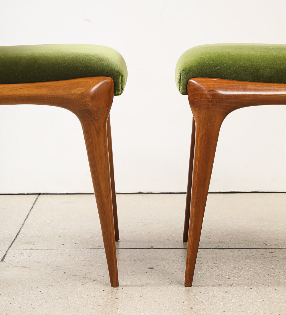 Walnut, fabric. Sculptural frames with upholstered seats and backs. Produced by Cassina, model 162.