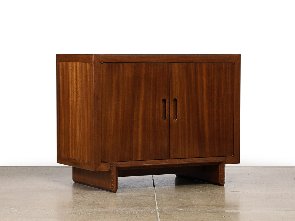 USA | C. 1950's Mahogany, mahogany veneer. 2-door cabinet with adjustable shelf and Taliesen carving around the bottom edge. Inside of one door retains branding of maker and designer signature. Produced by Heritage Henredon. **2nd matching cabinet is available.