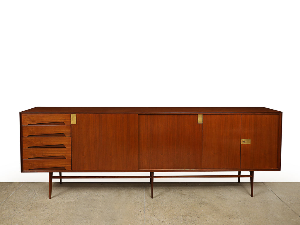 Italy | c. 1957 Walnut, brass. 5 drawers, 2 sliding doors with 1 shelf in each compartment, and 2 doors with 1 continuous shelf.