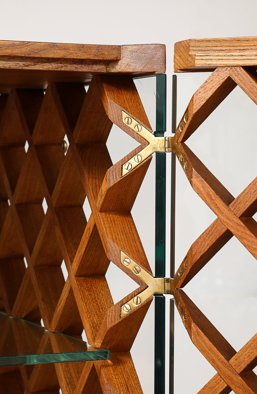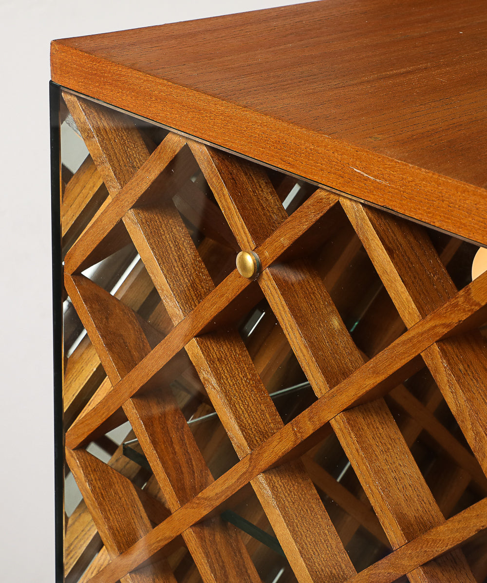 Elm wood, brass, mirrored glass, glass. Exquisite & early drinks cabinet. Linear form with diagonal grid pattern in wood. This vitrine combines a wooden exterior with an illuminated glass interior, creating a unique "cage-like" effect. This cabinet was originally shown in the VII Triennale exhibition – Milan, 1940.