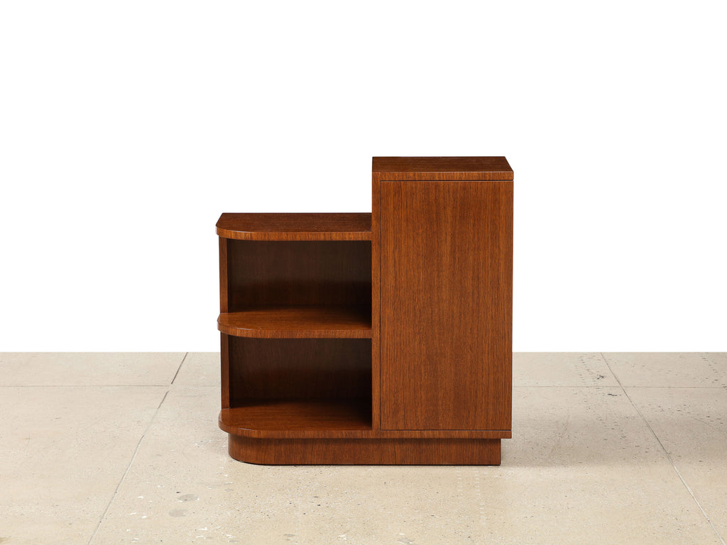 USA | 1936 Bog Oak, brass hinge. One side has a door with an adjustable shelf inside and the other has three open, curved shelves.
