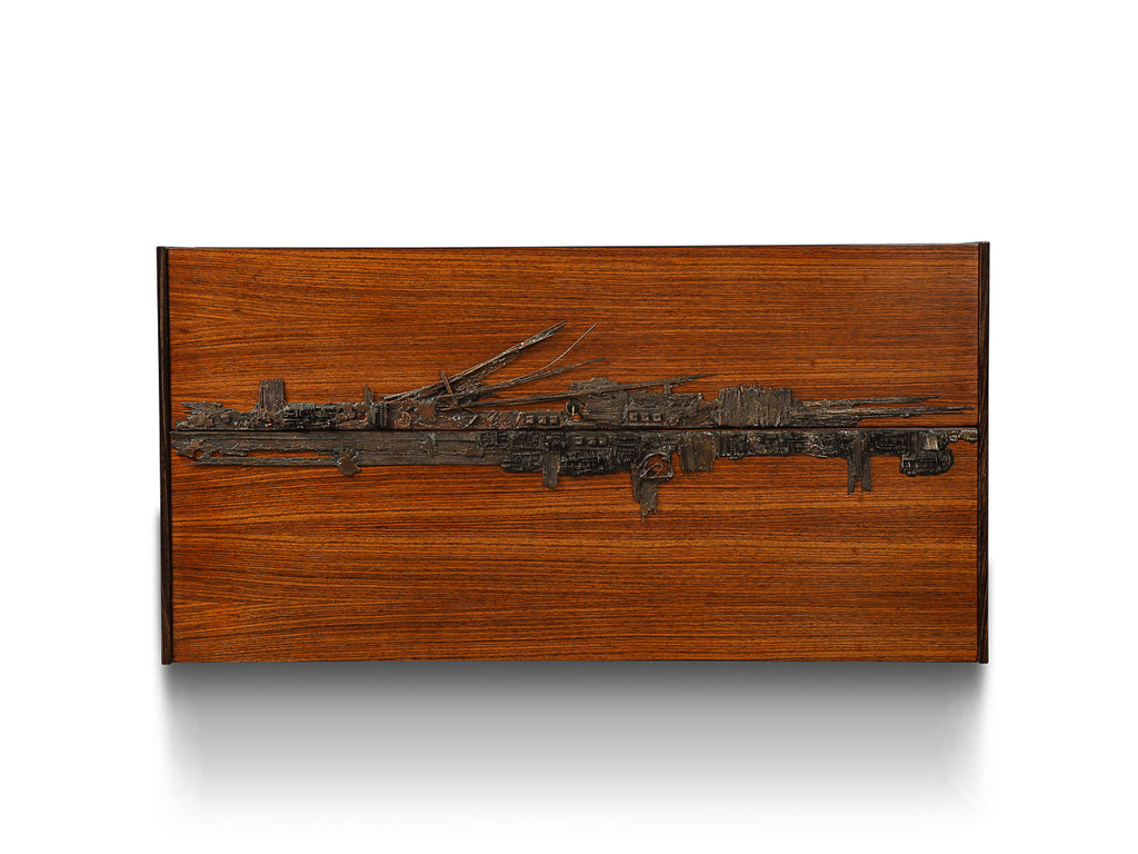 Mahogany, bronze, brass, glass. A rare wall-mounted cabinet with a 2-part relief sculpture in bronze by Arnaldo Pomodoro applied to the front. This cabinet features a vertical harmonica hinge system with 1 glass shelf inside. Original brass key included.