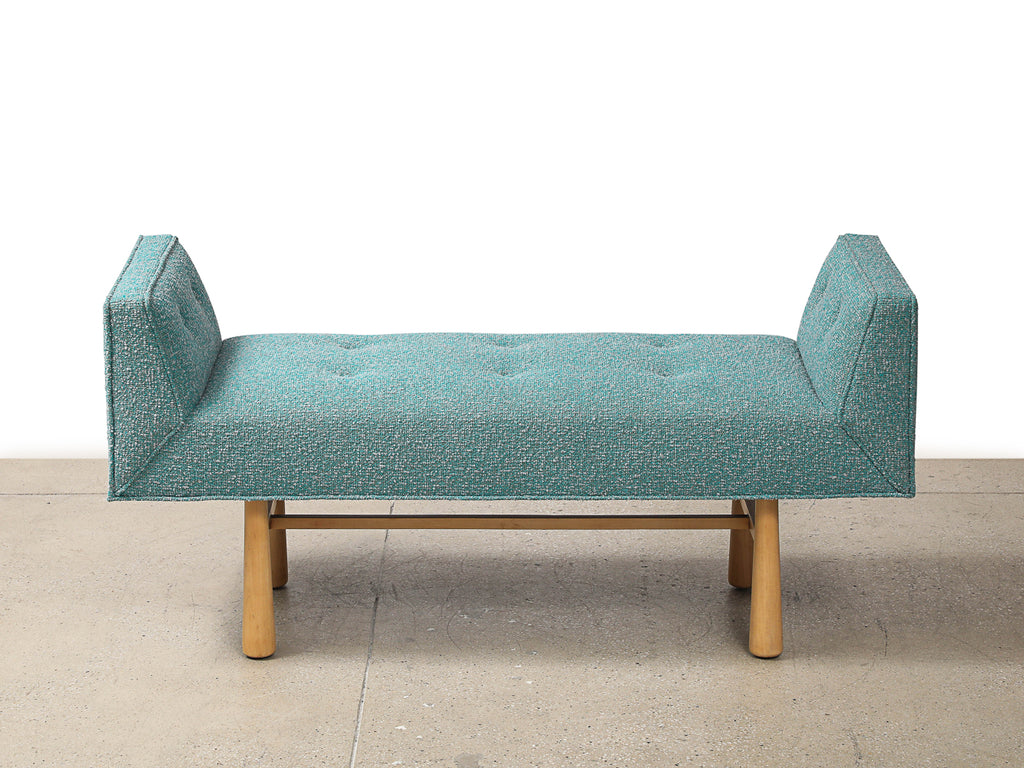 USA | c. 1950 Bleached mahogany, fabric. Produced by Dunbar. Four reverse-tapered legs supporting an upholstered seat with side supports.