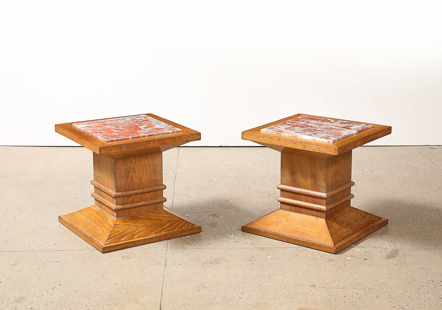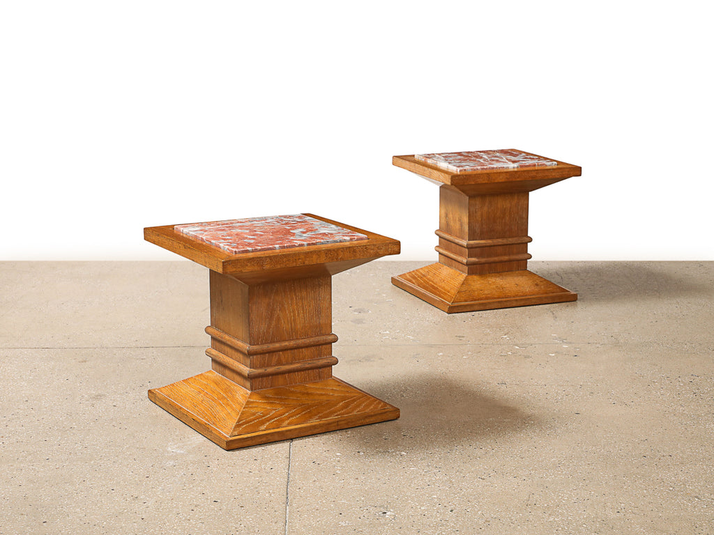 Oak, marble. 1940's style, column form side tables with inset marble tops.