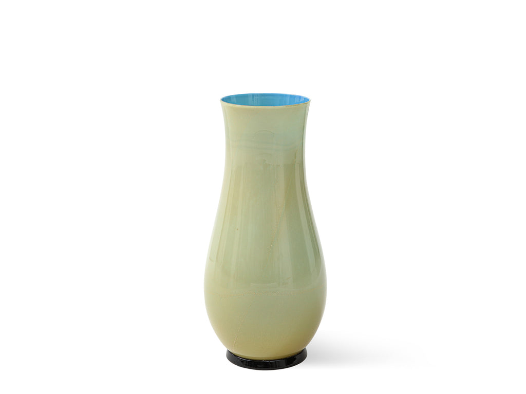 Italy | 1983 Incamciato glass, gold leaf. Opaque pale green glass with internal gold exterior, and turquoise glass interior. Applied black glass foot. Vietri Murano label affixed to the outer top. Signed and dated on the underside.