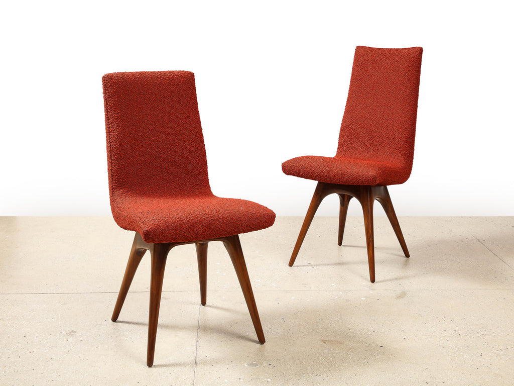 Walnut, upholstery. Eight armless chairs comprised of two taller chairs & six lower side chairs. Beautifully sculpted walnut bases. Upholstered in rust-red boucle.