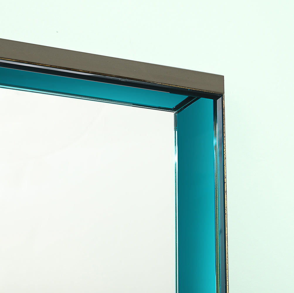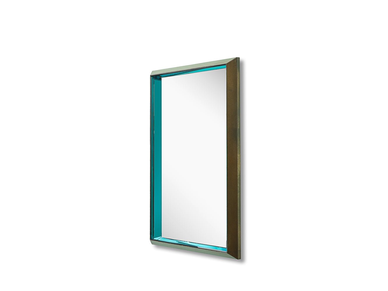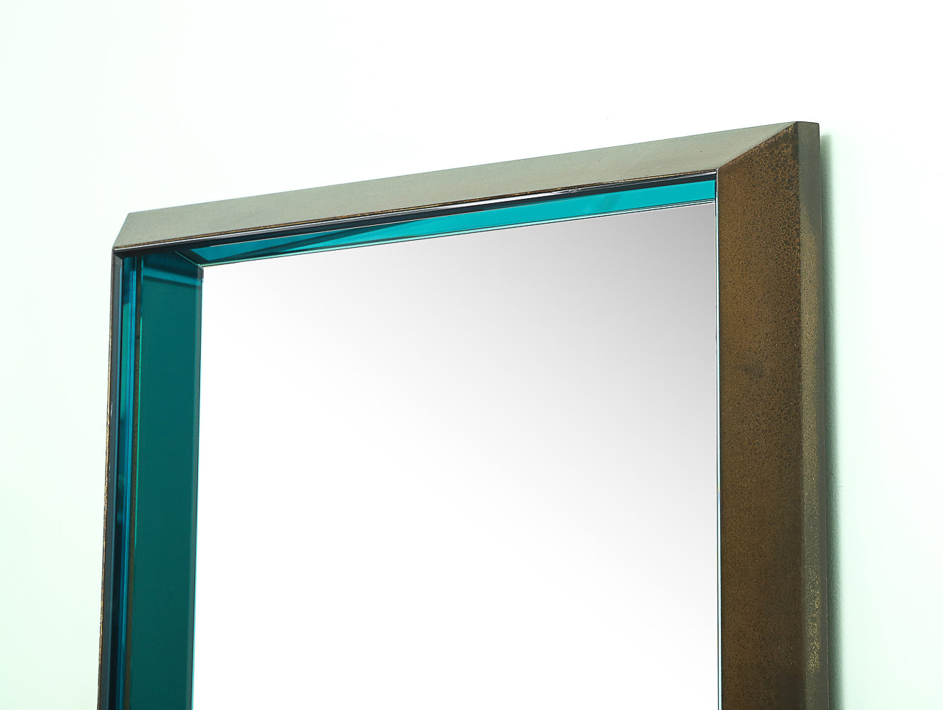 Italy | c.1962 Brass, colored glass, mirrored glass. Vertical mirror with exterior brass frame, and interior frame of beveled, aquamarine blue colored glass panels.