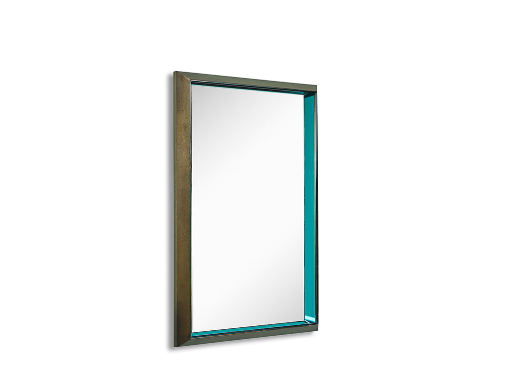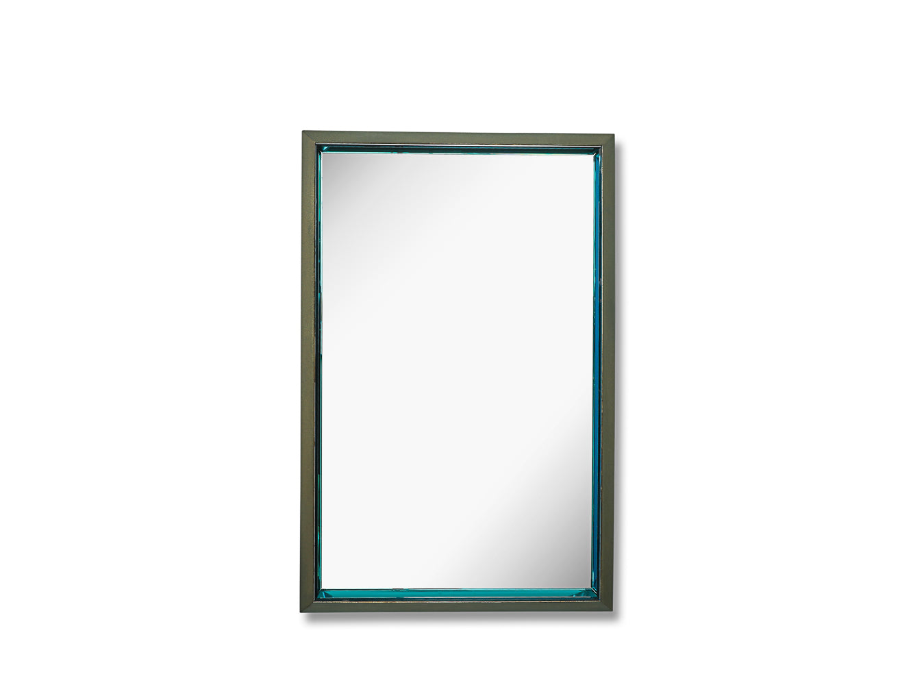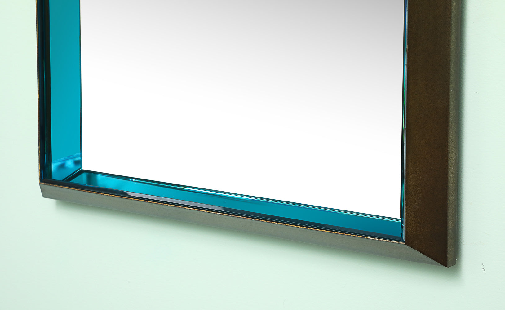 Italy | c.1962 Brass, colored glass, mirrored glass. Vertical mirror with exterior brass frame, and interior frame of beveled, aquamarine blue colored glass panels.