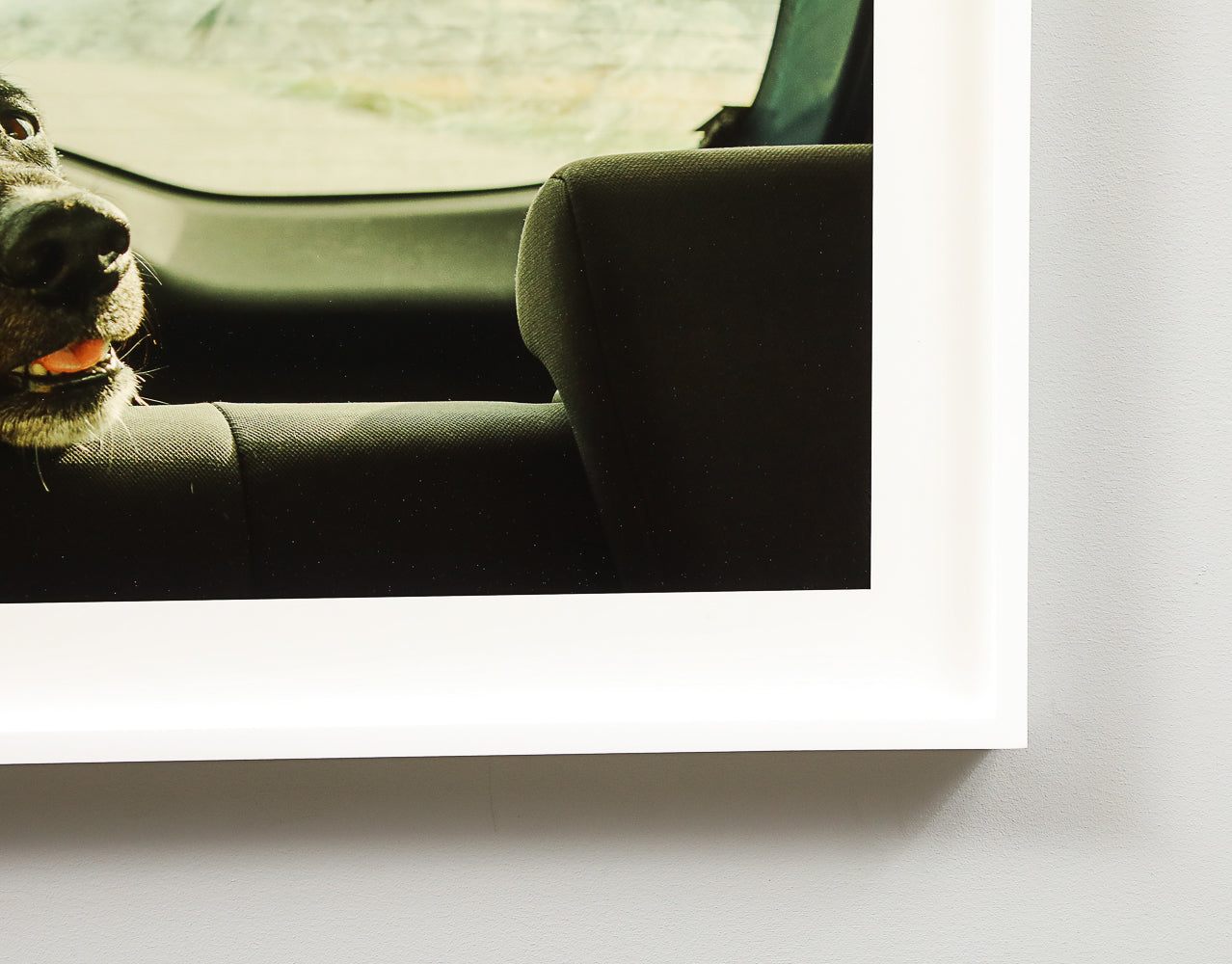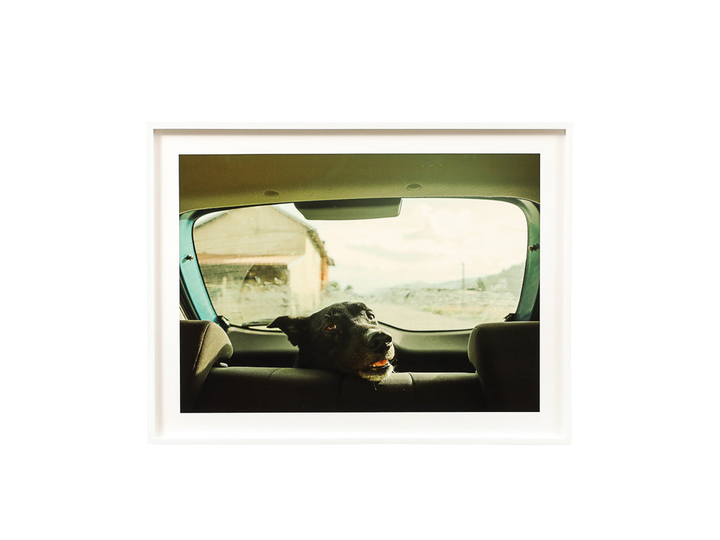 Italy | 2025 Wood, glass, photo paper. Color image of a dog in the back seat of a car.