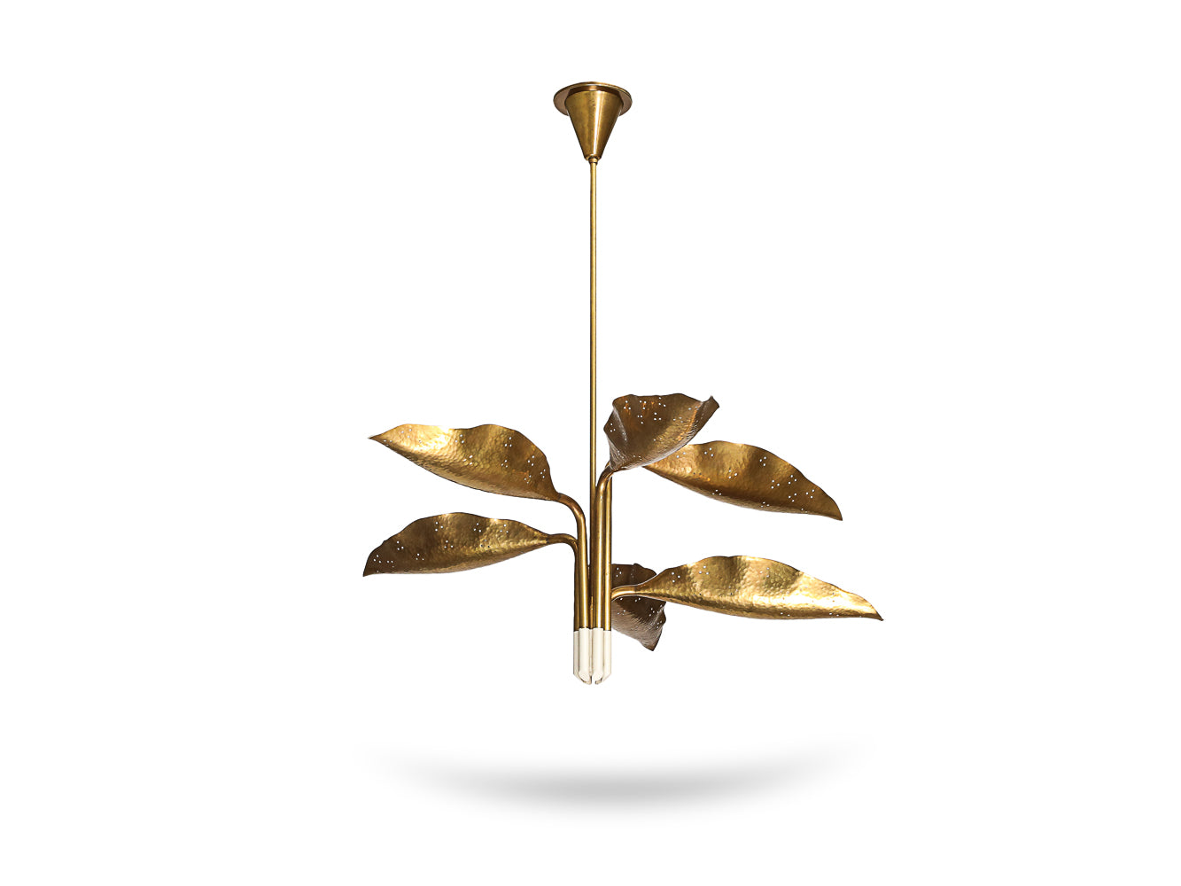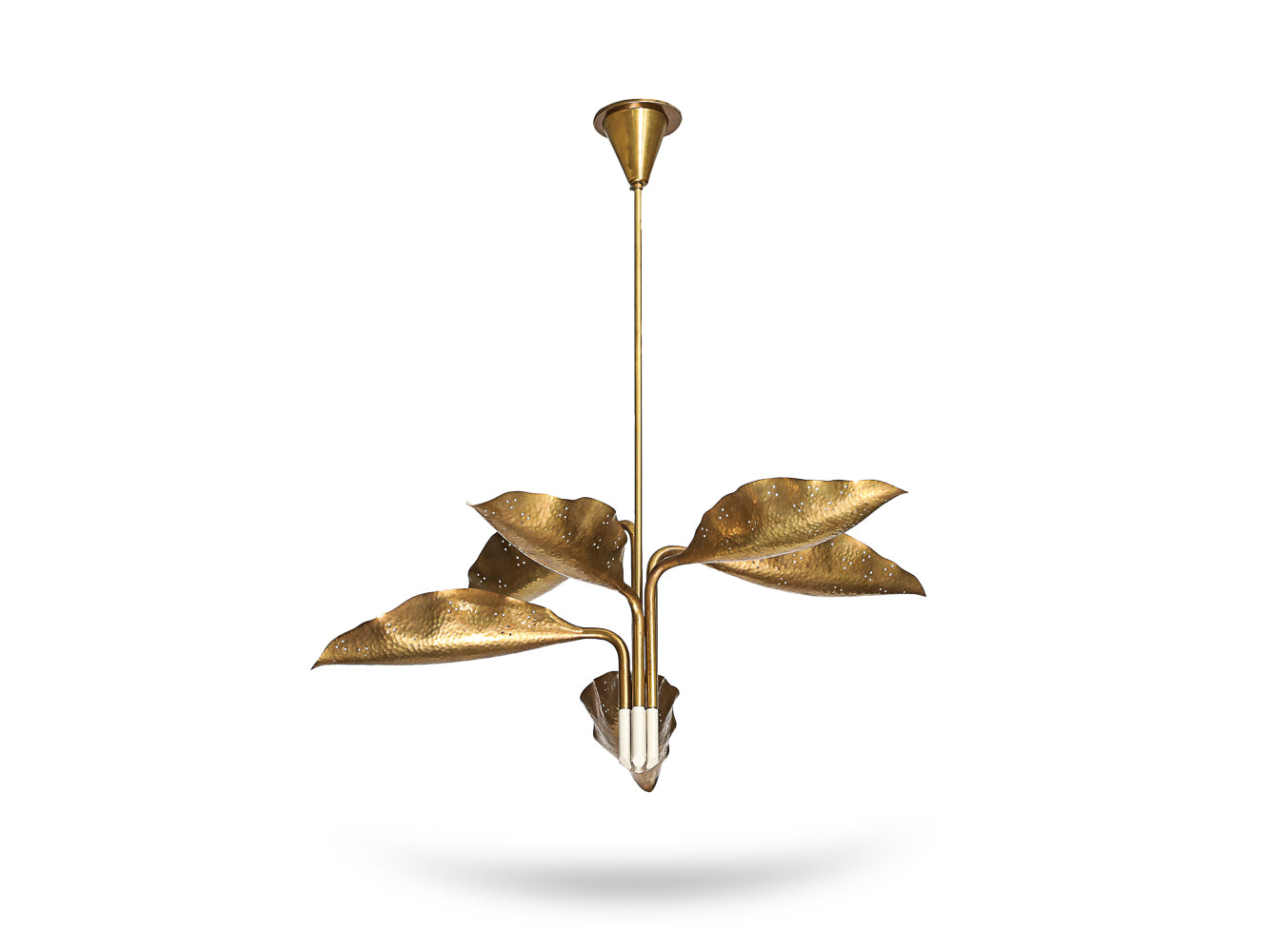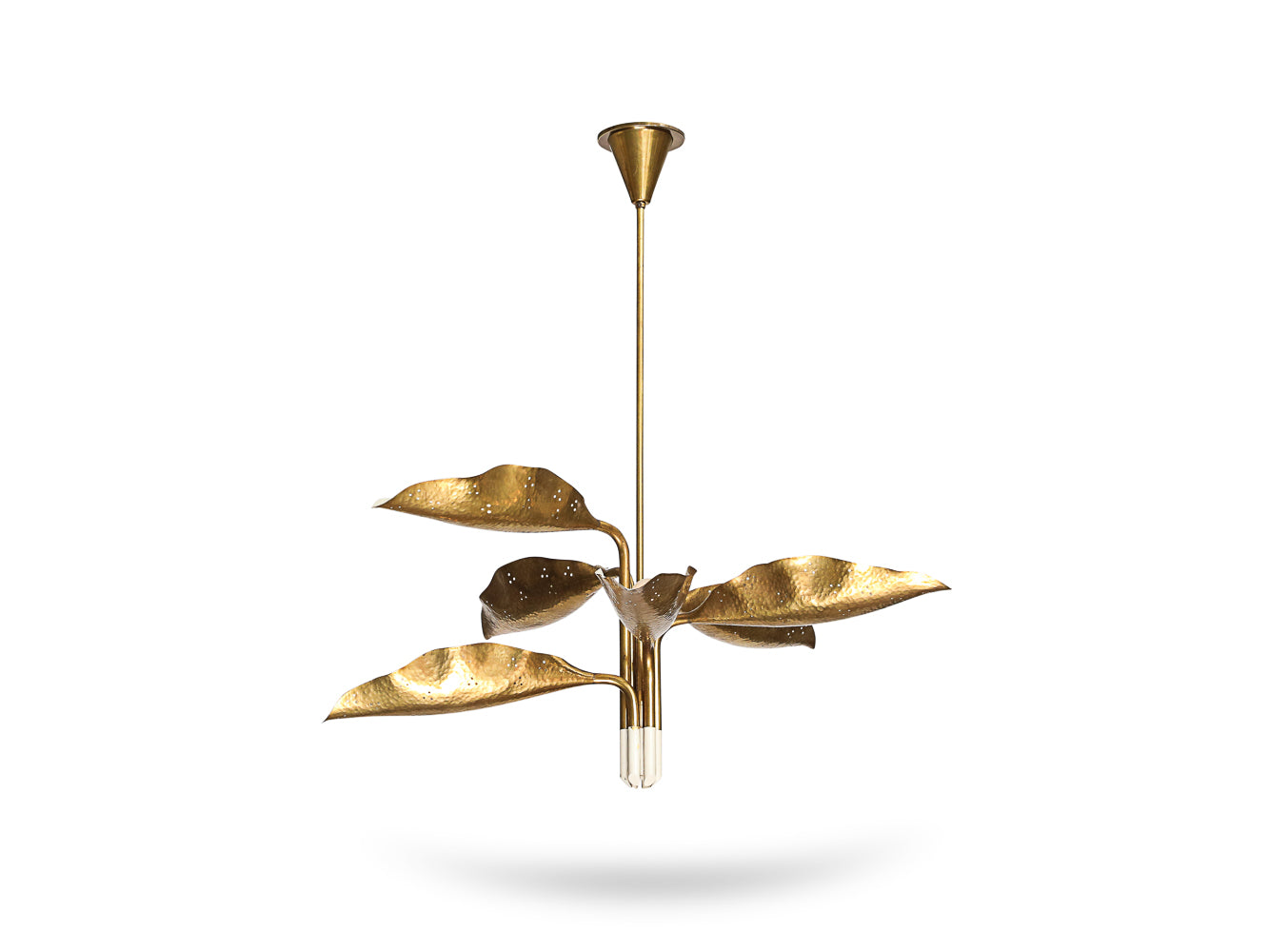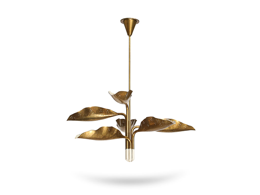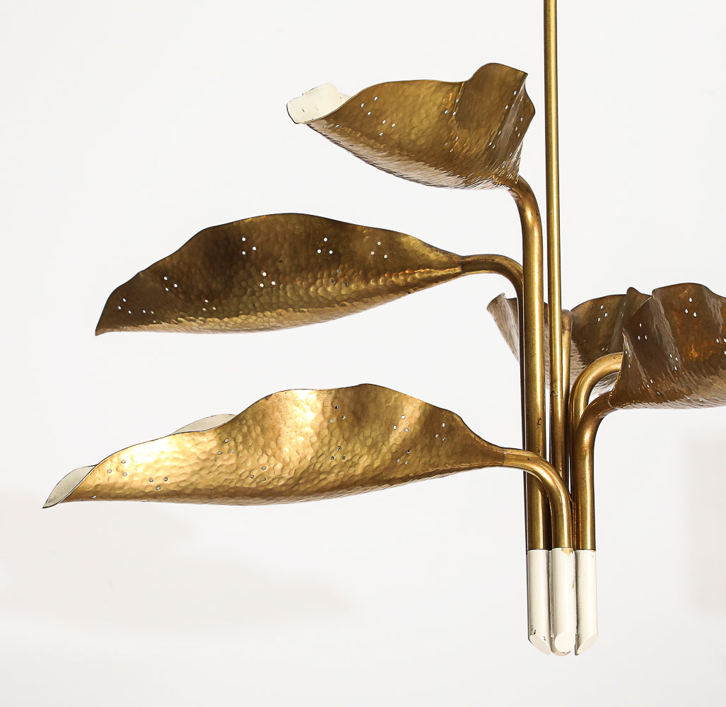 Italy | c. 1951 Brass, hammered brass, white lacquered brass. Six adjustable arms that each end in a leaf form concealing a socket. 6 x E26 sockets. This fixture has been UL listed.