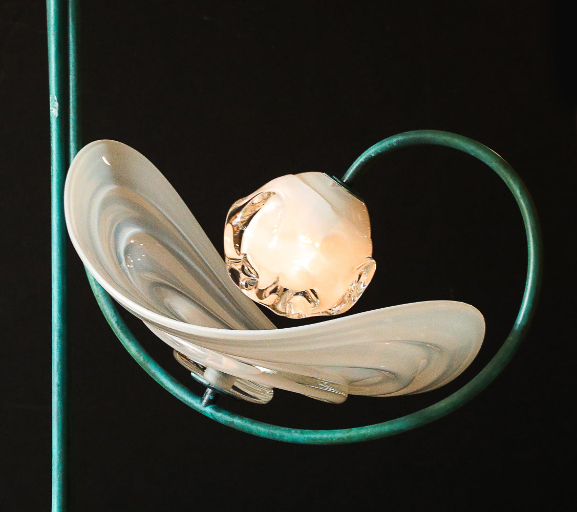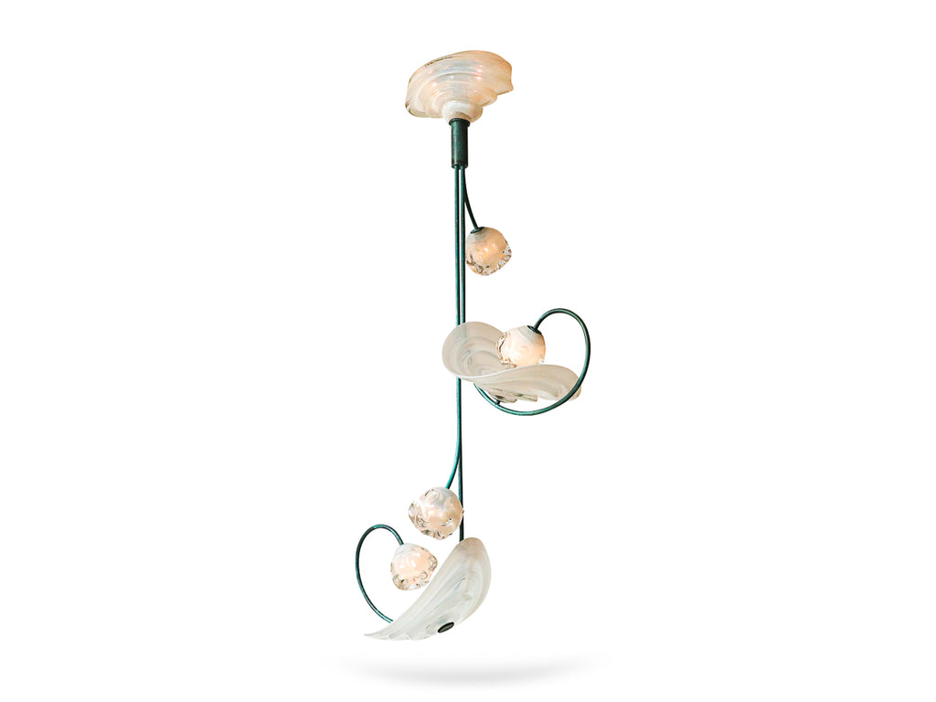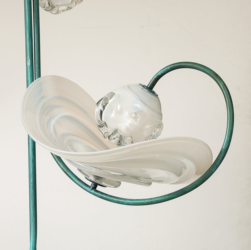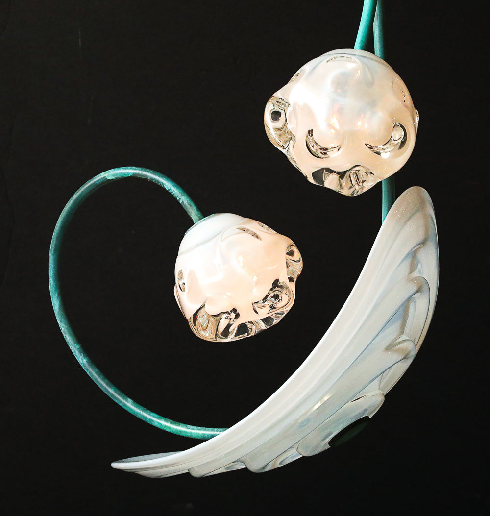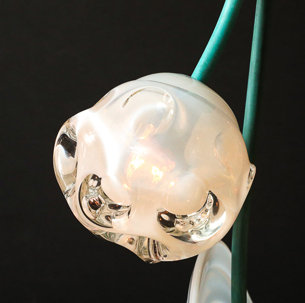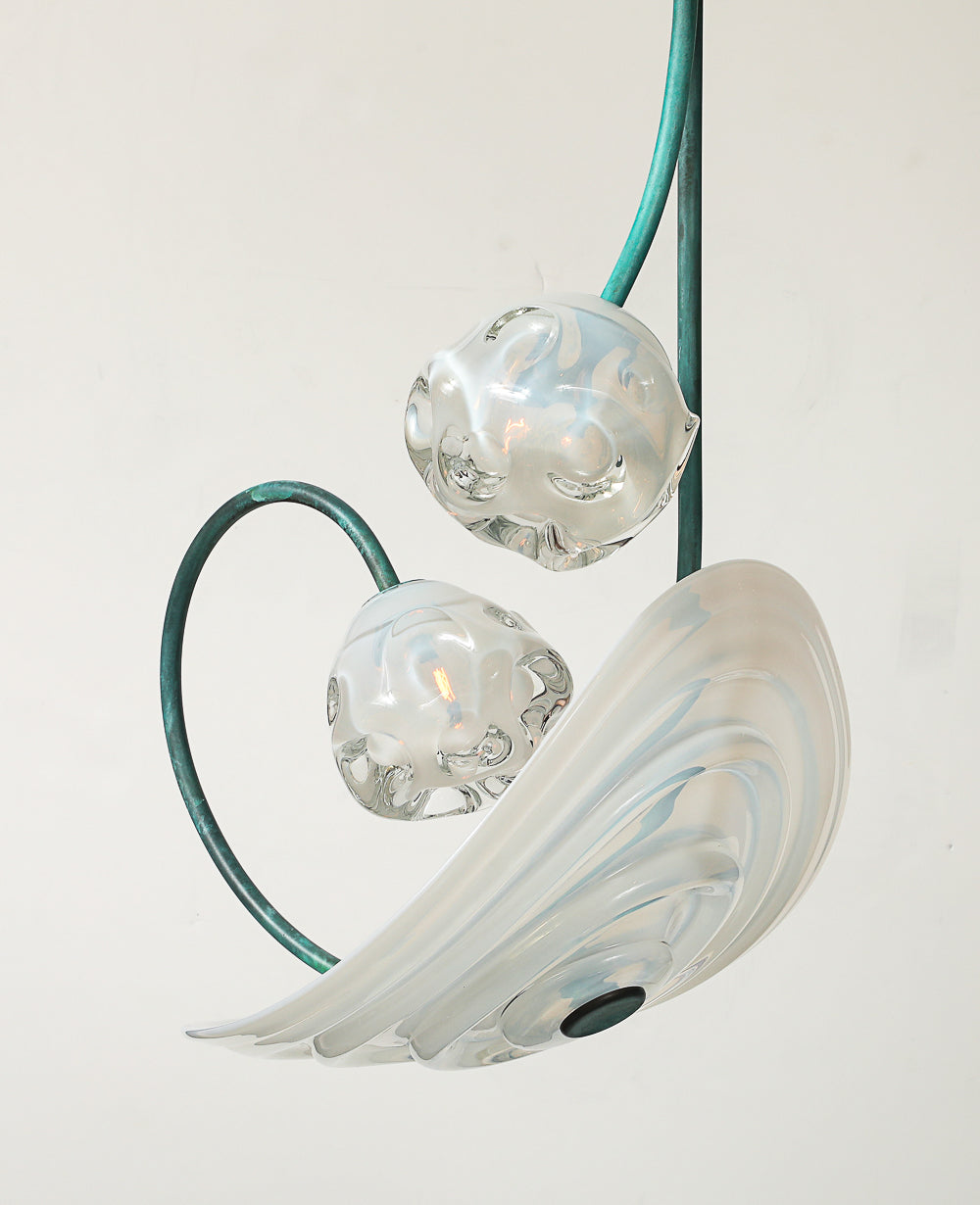 Oxidized metal, hand-blown glass, oxidized brass. Hot-sculpted, blown glass elements which include the canopy, morel shades and rippled reflectors. 6 x E12 [candelabra] sockets - recommended bulbs are T-3 KX-2000 incandescent. Made here in New York City and comes UL certified. Custom variations are available.