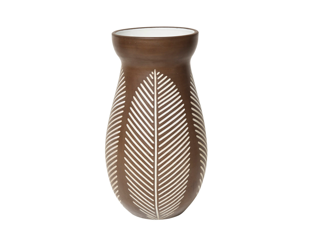 Italy | c. 1956 Hand-thrown earthenware vase. Brown & white glazes with incised leaf pattern & interior glaze.