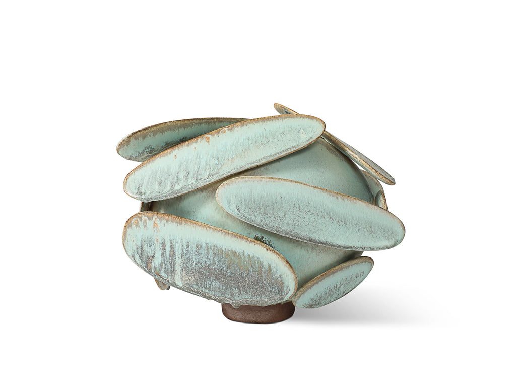 USA | 2025 Glazed stoneware. Footed ovoid vase with blue glazes & applied oval discs. Artist signed on underside.