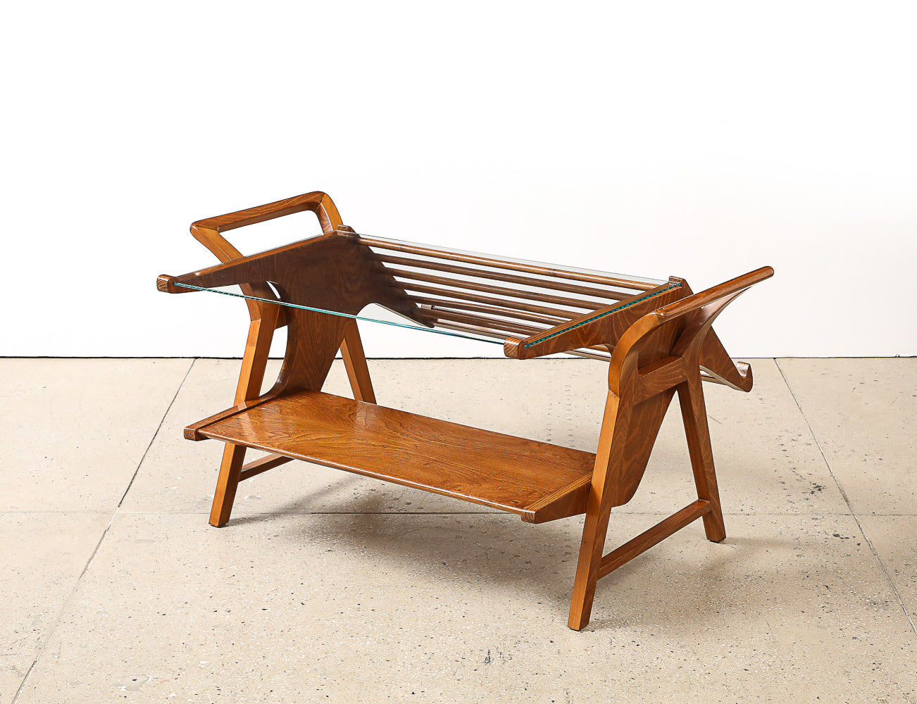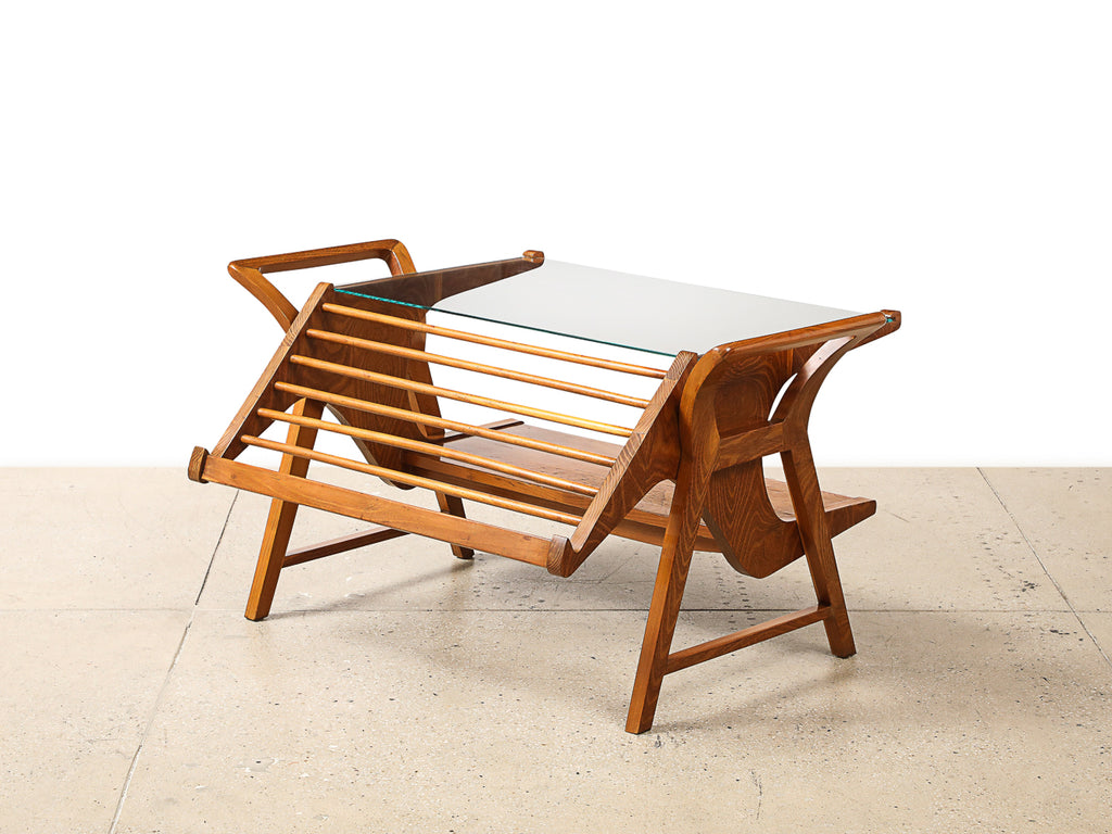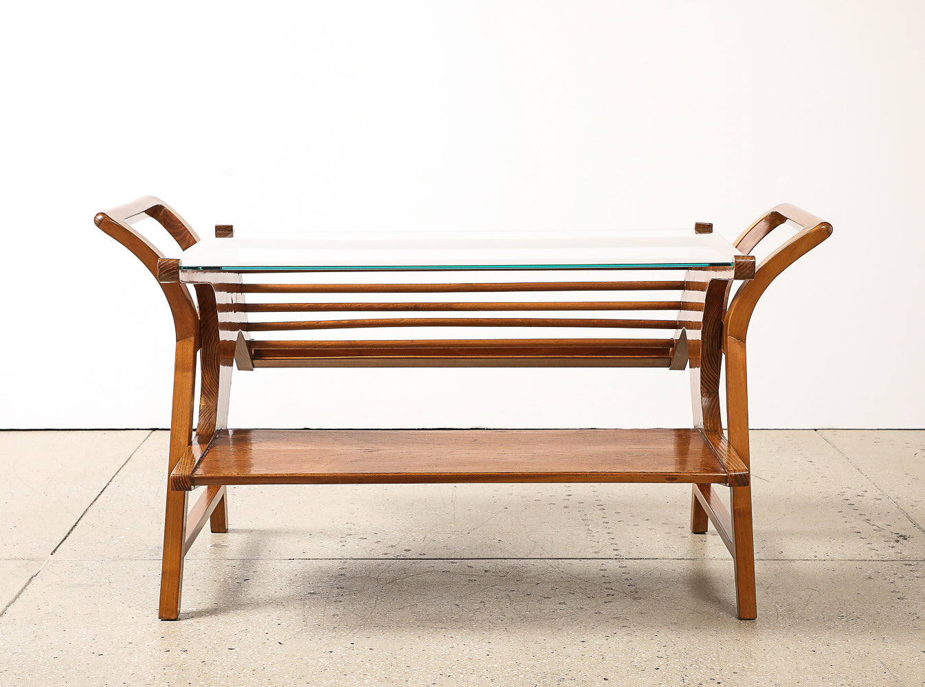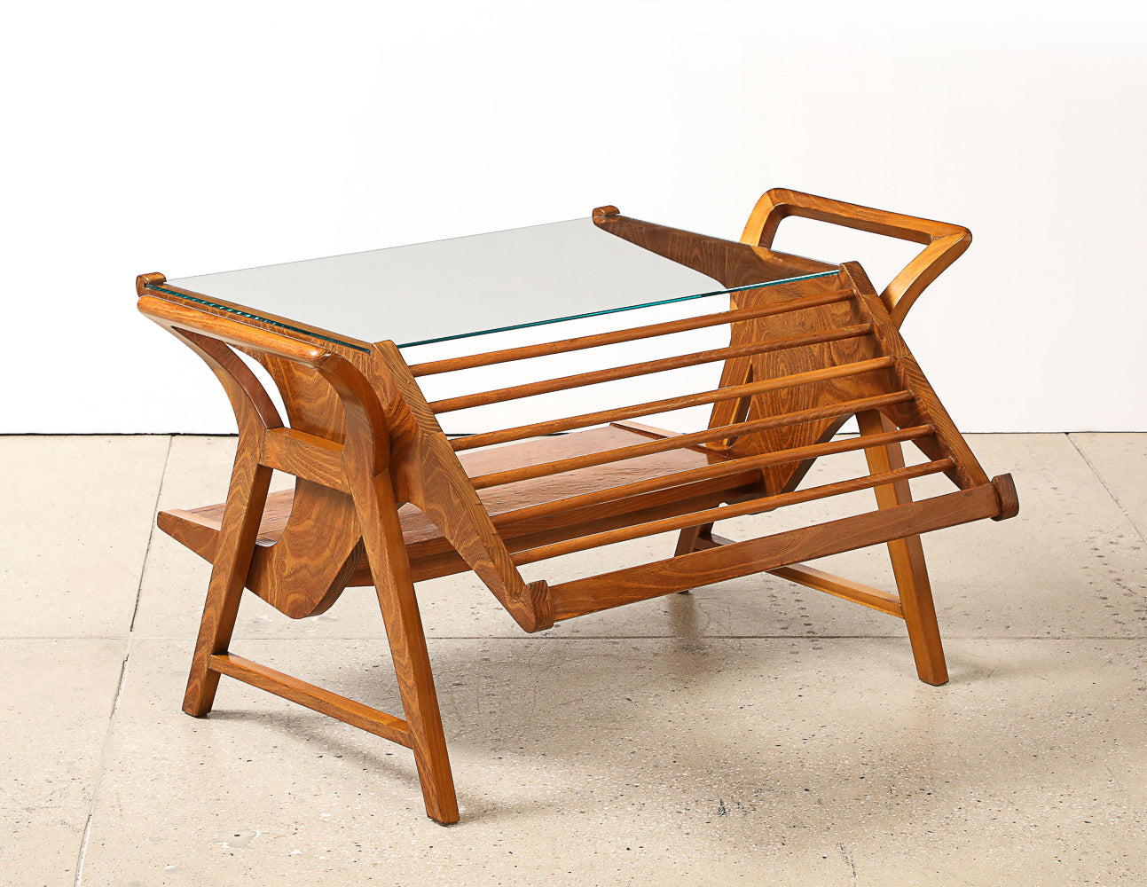 Chestnut, glass. Large-scale side table with original glass table top, rails for magazines and a lower shelf. Execution by Pagani Carlo di Antonio, Cantu. Most likely a unique piece.