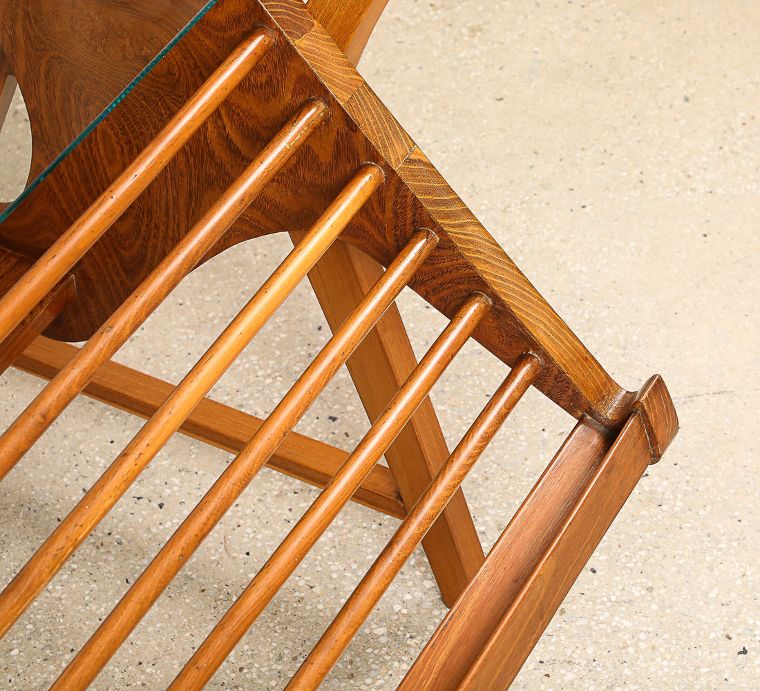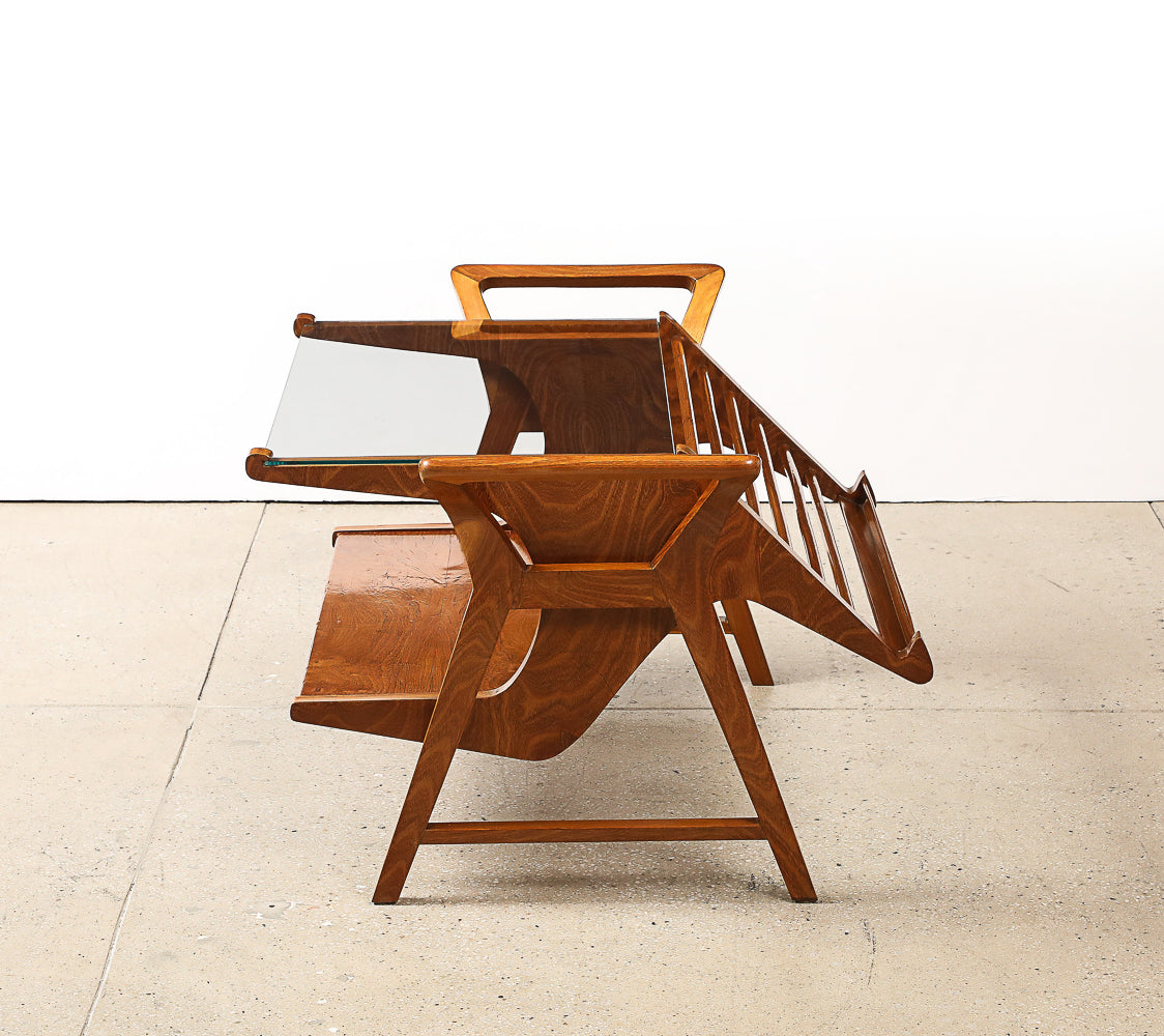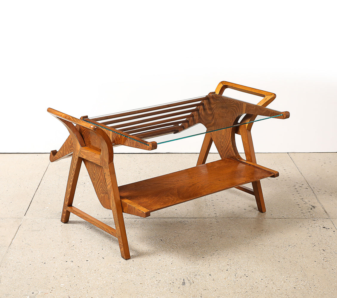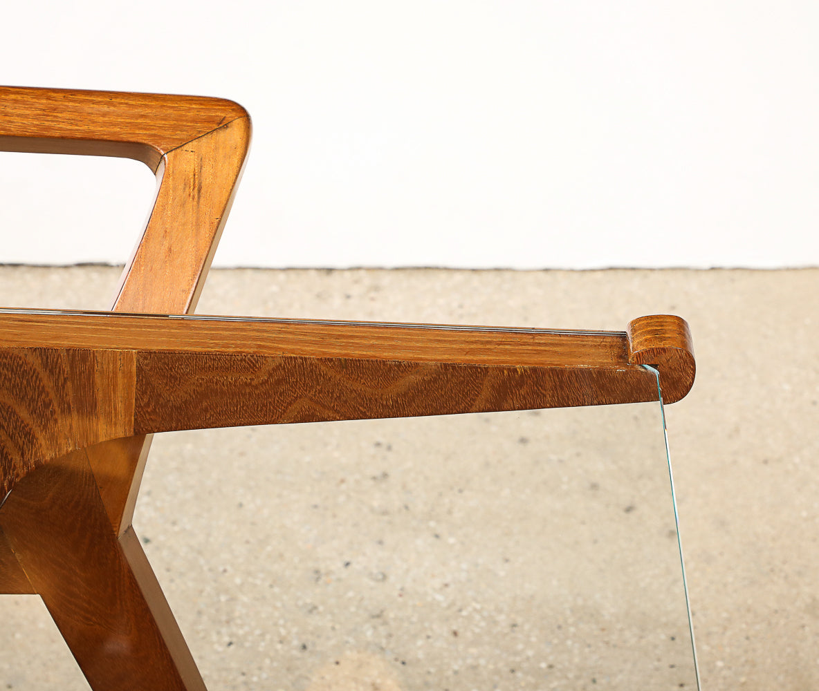 Chestnut, glass. Large-scale side table with original glass table top, rails for magazines and a lower shelf. Execution by Pagani Carlo di Antonio, Cantu. Most likely a unique piece.