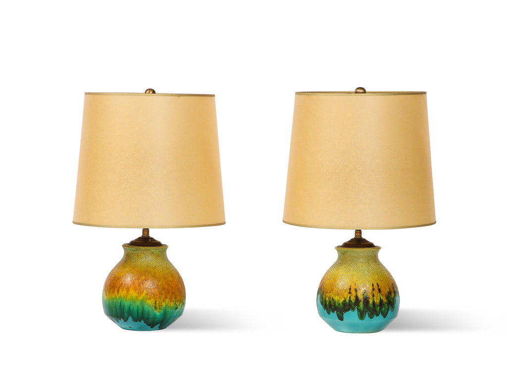 Italy | c. 1961 Glazed stoneware, brass, paper. Handmade ceramic with blue, yellow and green glazes. Each lamp has 2 standard E26 sockets, with pull chain and new paper shade.